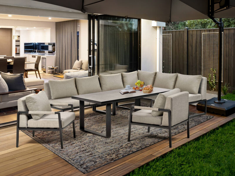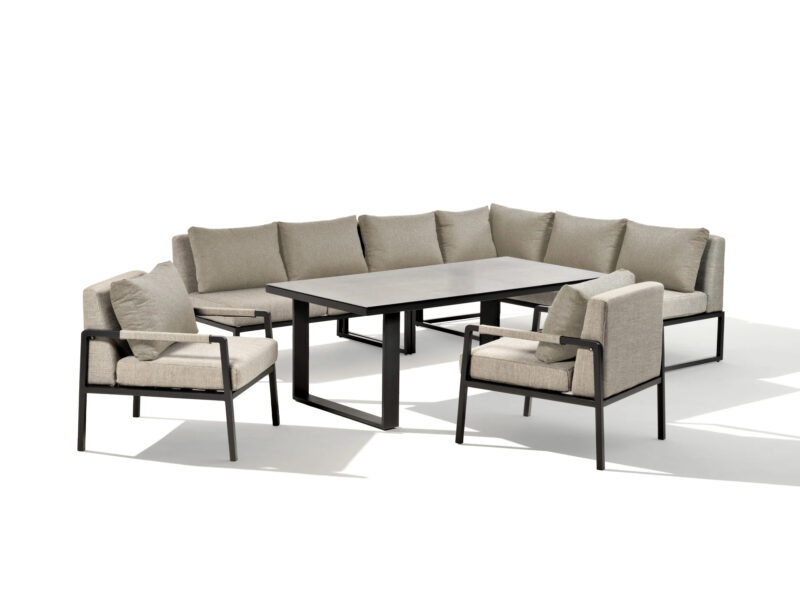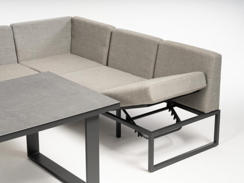 Rohová stolová súprava Leyla ponúka kombináciu pohodlia a praktickosti pre váš exteriér. Skladá sa z dvoch kresiel, priestrannej rohovej sedačky s funkciou sklápania a stabilného stola so sinterstone doskou. Možnosť zostavenia na pravú aj ľavú stranu zabezpečuje flexibilitu.