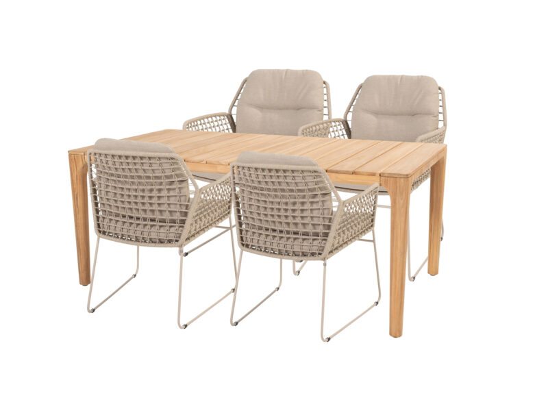 Elegantná jedálenská súprava Liam Albano (1+4) spája prírodný vzhľad teakového dreva s moderným rope dizajnom. Stôl Liam s lamelovou doskou a štyri pohodlné stoličky Albano v odtieni latte vytvárajú harmonickú kombináciu pre štýlové stolovanie vonku aj pod altánkom.