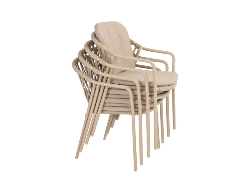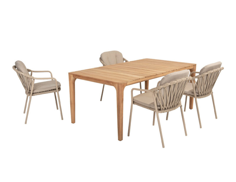 Stolová súprava Liam Manitoba spája prírodnú krásu a moderný dizajn. Obsahuje 4 stohovateľné stoličky Manitoba s hliníkovým rámom, rope výpletom a pohodlnými sedákmi, doplnené o elegantný stôl Liam z teakového dreva.