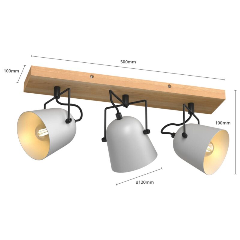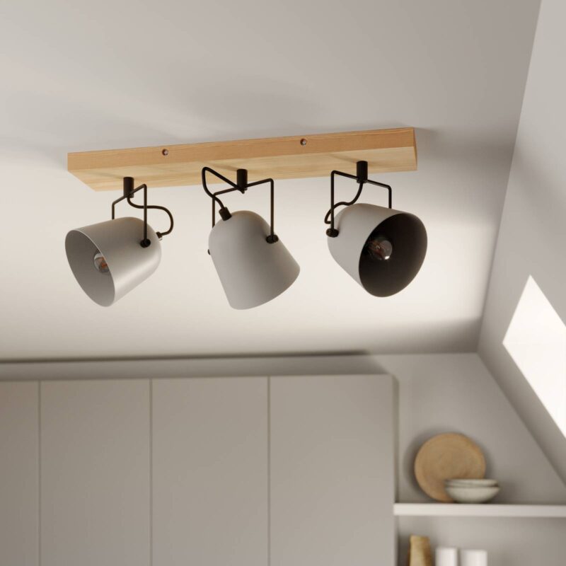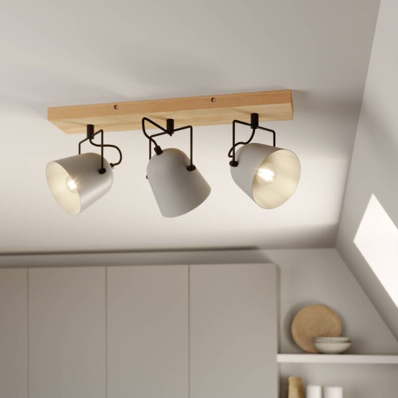 Troj žiarovkové stropné svetlo Adalin v šedej farbe v robustnom prevedení z dreva a ocele Kto hľadá robustné stropné svietidlo špeciálneho vzhľadu, stropné svietidlo Adalin ho nesklame. Skladá sa z podlhovastého stropného držiaka vyrobeného zo svetlého duba a nesúceho tri tienidlá vyrobené z ocele a zobrazené v jemnej šedej farbe. Svietidlo môže byť vybavené žiarovkami E14, ktoré generujú potrebné svetlo, a rozsiahle osvetlenie je možné zaručiť vďaka obrazovkám, ktoré sú orientované v rôznych smeroch. Výrazný exteriér stropného svetla Adalin vytvára útulné prostredie a v interiéri vytvára jemný vkus vidieckeho domu.