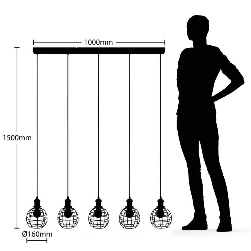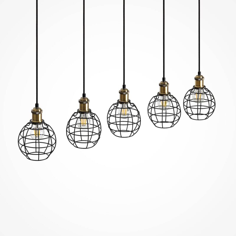 Stropné svietidlo Alexej s piatimi lampami s trendovým vzhľadom klietky Závesné svietidlo Alexej sa skladá z podlhovastého stropného držiaka, ku ktorému je pripevnených päť samostatných závesov. Tieto filigránové závesy majú každý tienidlo v trendy klietkovom vzhľade. Vďaka tomu je lampa dekoratívnym prvkom v priemyselnom štýle. Ale tienidlá nielen dobre vyzerajú, ale tiež zabezpečujú efektívnu hru svetla a tieňa.