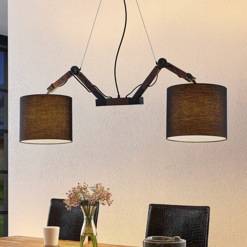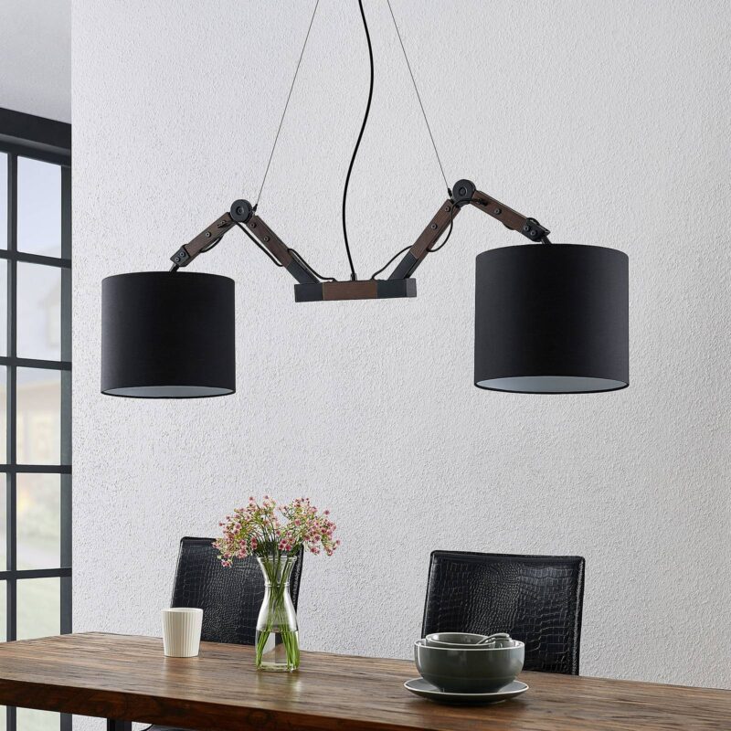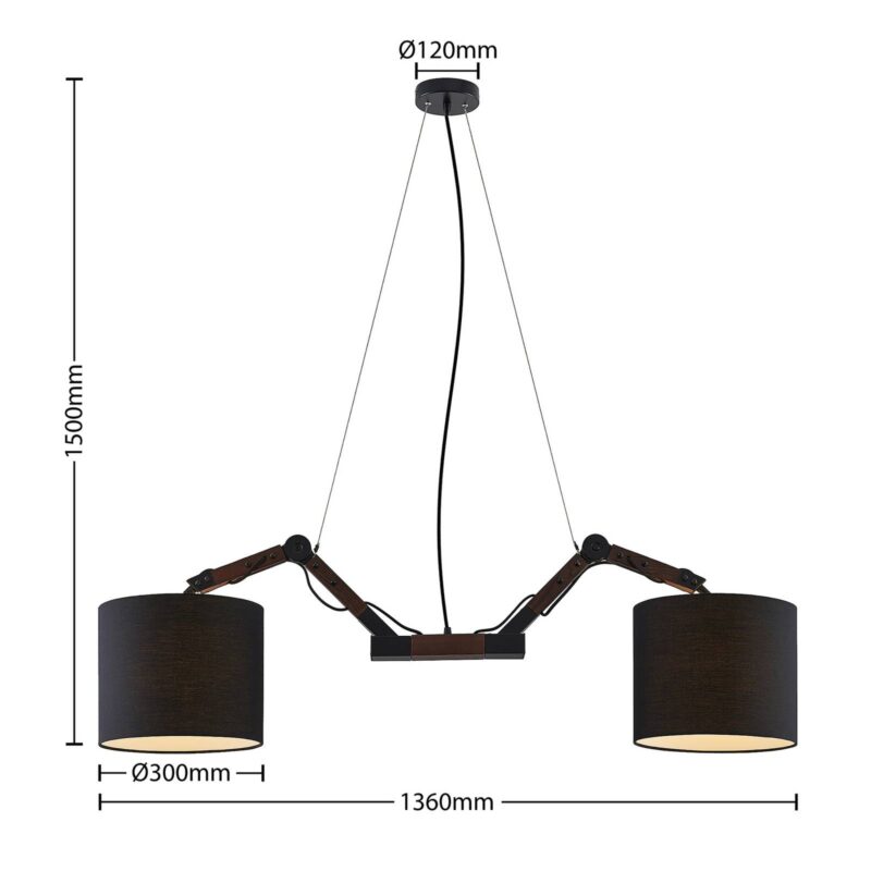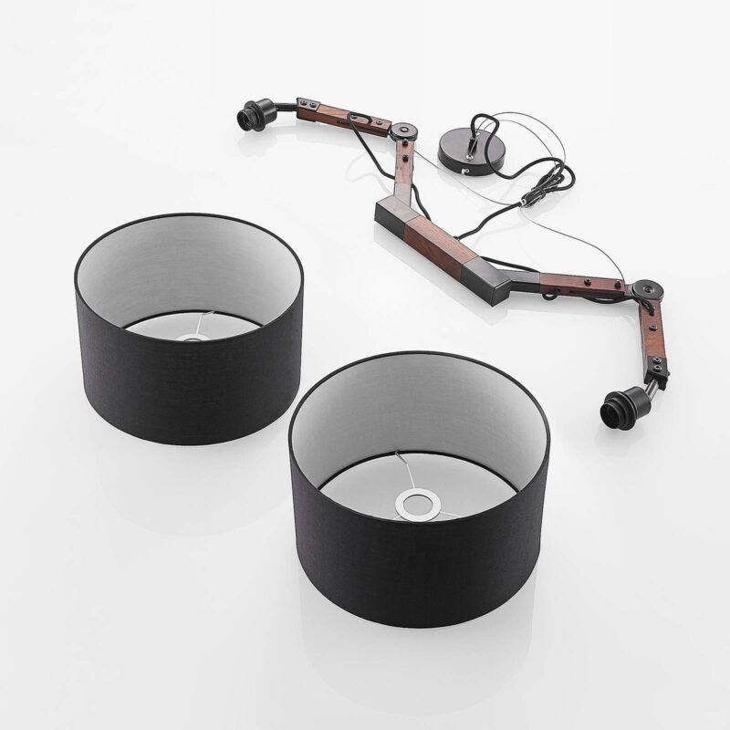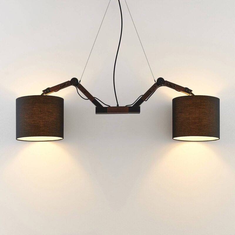 Závesná lampa Alsabet z dvoch plameňov vyrobená z dreva Závesná lampa Alsabet je niečím veľmi zvláštnym a spája v sebe módny štýl s praktickými vlastnosťami. Skladá sa z dvoch tienidiel, každý pripevnený k drevenému ramenu. Jeho rám je vyrobený z dreva a má dva závesy, pomocou ktorých je možné podľa potreby nastaviť výšku a uhol svetelných prvkov. Ich tienidlá sú vyrobené z čierneho železa a obklopujú osvetľovaciu látku, ktorá sa má použiť. Tienidlo, ktoré sa otvára smerom dole, vytvára dokonalé osvetlenie napríklad pre jedálenský stôl. Farebný kontrast svetlého dreva a čierna farba vytvárajú atraktívny celkový obraz.