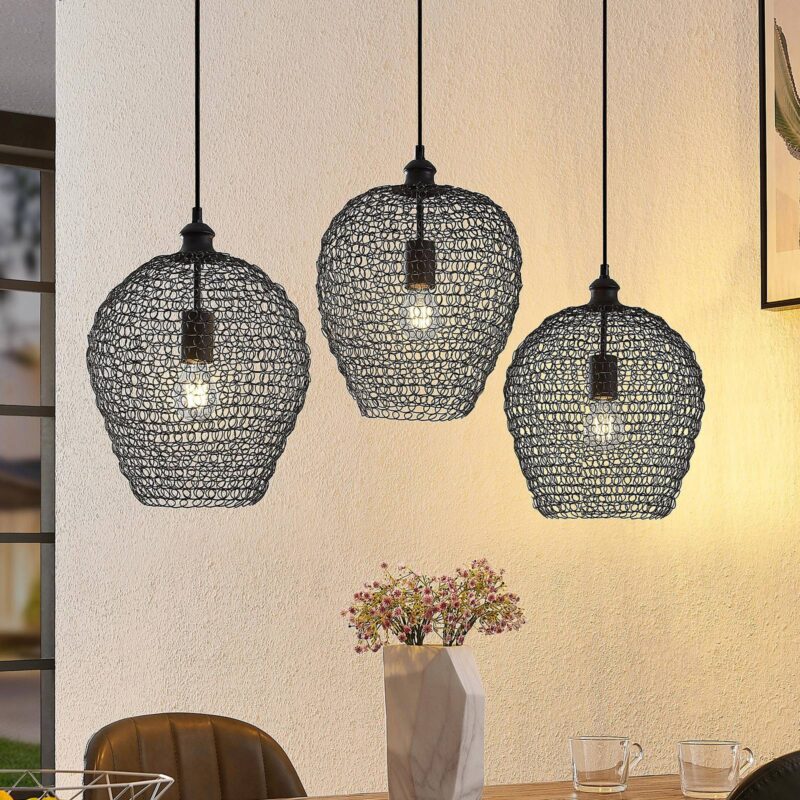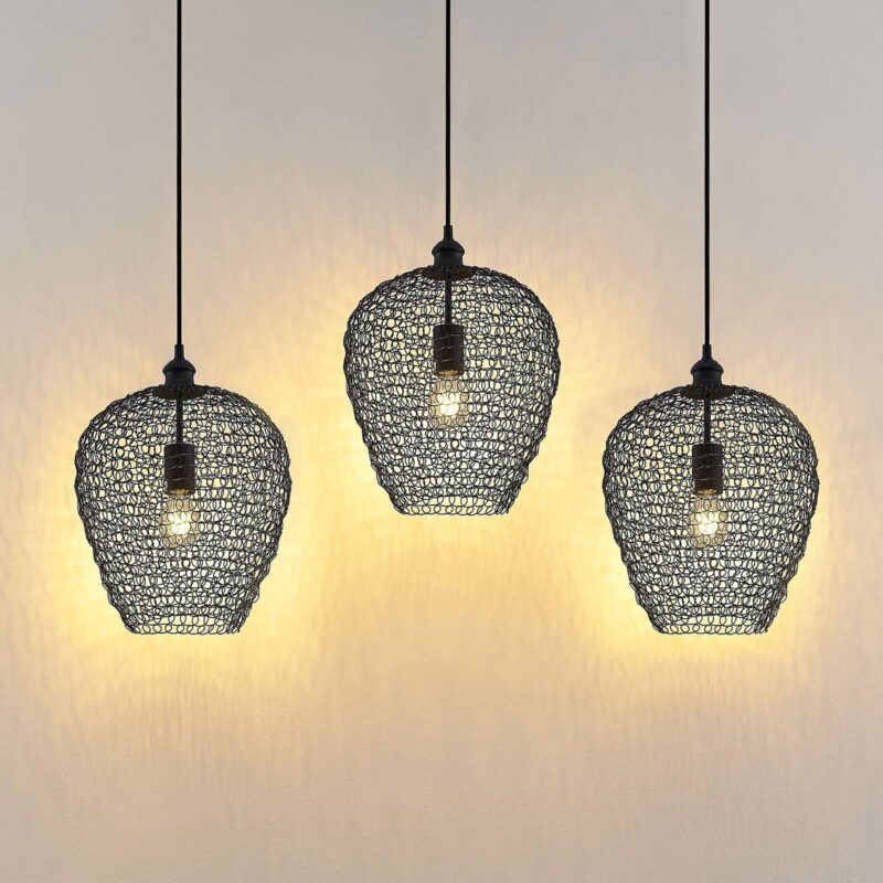 Závesná žiarovka Benja s tromi žiarovkami s osnovným vzhľadom – veľmi pekná na osvetlenie jedálenského stola Benja má tri tienidlá, ktoré nie sú klasicky tvarované, ale sú vyrobené z kovu s jemnými okami a sú dosť priesvitné. Stále teda môžete dobre vidieť zdroj svetla a mali by ste si ho zvoliť tak, aby pôsobil dekoratívne a zapadal do celkového vzhľadu. Svetelné efekty sú útulné a individuálne, v miestnosti sa vytvára nádherná hra jemných tieňov a svetelných sekvencií, ktoré príjemne podčiarkujú útulnosť. Závesná lampa s predĺženým tvarom troch lámp je obzvlášť vhodná na osvetlenie stola v jedálenskom kúte.