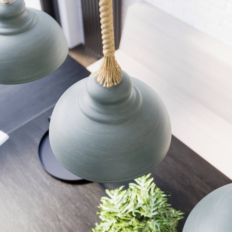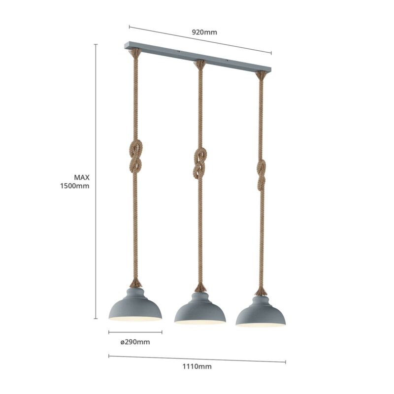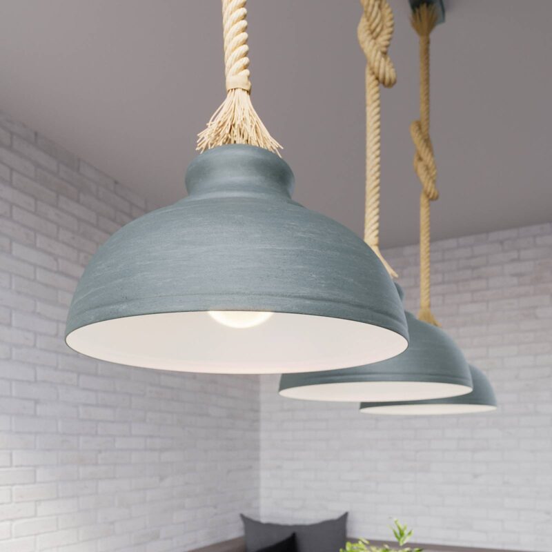 Troj-plameňová závesná lampa Chaby s lanom viazaným do uzla a betónovým vzhľadom Pri troj-plameňovej závesnej lampe Chaby je kábel skrytý za 2 cm hrubým lanom vyrobeným z konope, ktoré bolo uprostred zviazané do uzla. Železné tienidlo vyniká vďaka betónovému vzhľadu, v ktorom vďaka faktu, že je v spodnej časti otvorené pôsobia mimoriadne efektne filamentové žiarovky. Lampa sa môže kombinovať s rôznymi štýlmi bývania a vzhľadom na jej dĺžku sa veľmi dobre hodí nad dlhý jedálenský stôl.