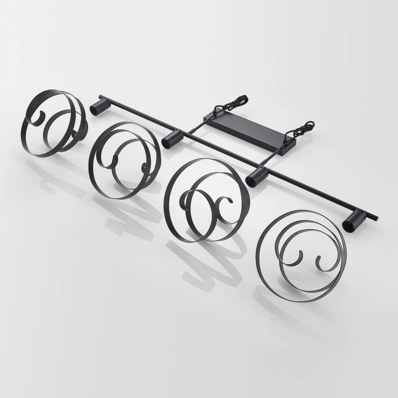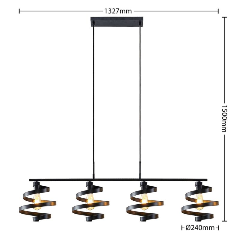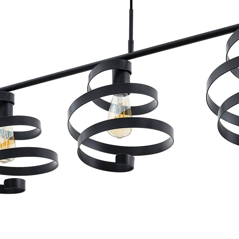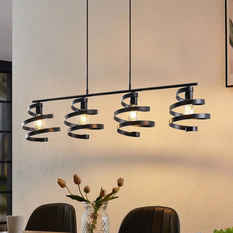 Štvorsvetelné závesné svietidlo Colten v tvare lúča s čiernymi špirálovými tienidlami, exkluzívny dizajn Colten je závesné svietidlo, ktoré presvedčí vzhľadom, ktorý stojí za to vidieť a ktorý sa vyznačuje špeciálnym dizajnom. Namiesto bežných tienidiel sa tu používajú umne stočené kovové špirály, ktoré sú úplne čierne a majú väčšie voľné priestory, takže dizajn pôsobí ľahko a priesvitne. Svetelné zdroje sú preto vždy jasne viditeľné a určite sú súčasťou celkového vzhľadu, takže by mali pôsobiť čo najzdobnejšie, ako je to v prípade žiaroviek alebo rustikálnych svietidiel, ktoré sú vďaka technológii LED zvyčajne aj veľmi účinné. Aj tu možno odporučiť mimoriadne teplé svetlé farby, ktoré všetko zútulnia a z jedálenského stola alebo pultu urobia miesto, kde si môžete večer pohodlne sadnúť a vychutnať si spoločné jedlo alebo drink po práci.