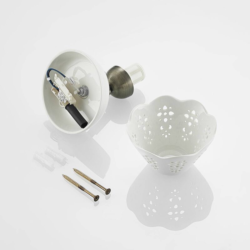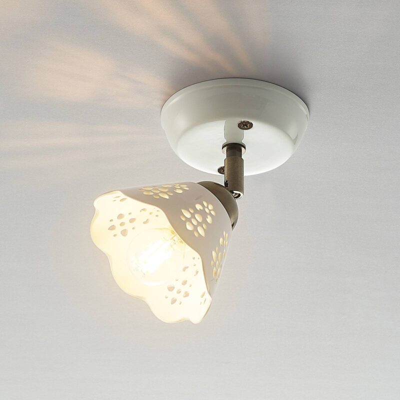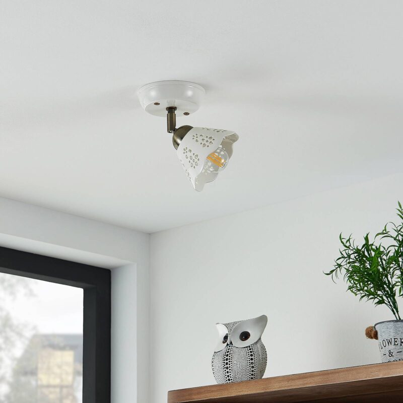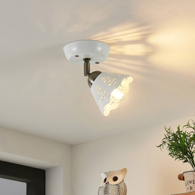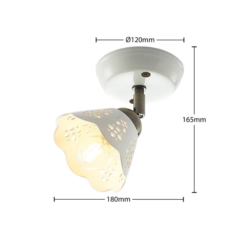 Radiátor Einflammiger Efgenia vyrobený z keramiky a železa s hravým tienidlo na lampu Spot Efgenia presviedča svojim solídnym a hravým dizajnom s vkusom vidieckeho domu. Jeho okrúhly držiak je možné pripevniť na strop alebo na stenu a umožňuje flexibilné umiestnenie. Telo svietidla je vyrobené z keramiky a železa a je zobrazené v harmonickej farebnej kombinácii bielej a bronzovej. Vybavený hravým tienidlo na lampu s Leuchmittel E14, takže generované svetlo presvitá prostredníctvom svojich vyrazených, atraktívnych foriem a vytvára zaujímavú hru svetla. Reflektor Efgenia sa dobre integruje do štýlu vybavenia a vytvára útulné prostredie v rámci nábytku.