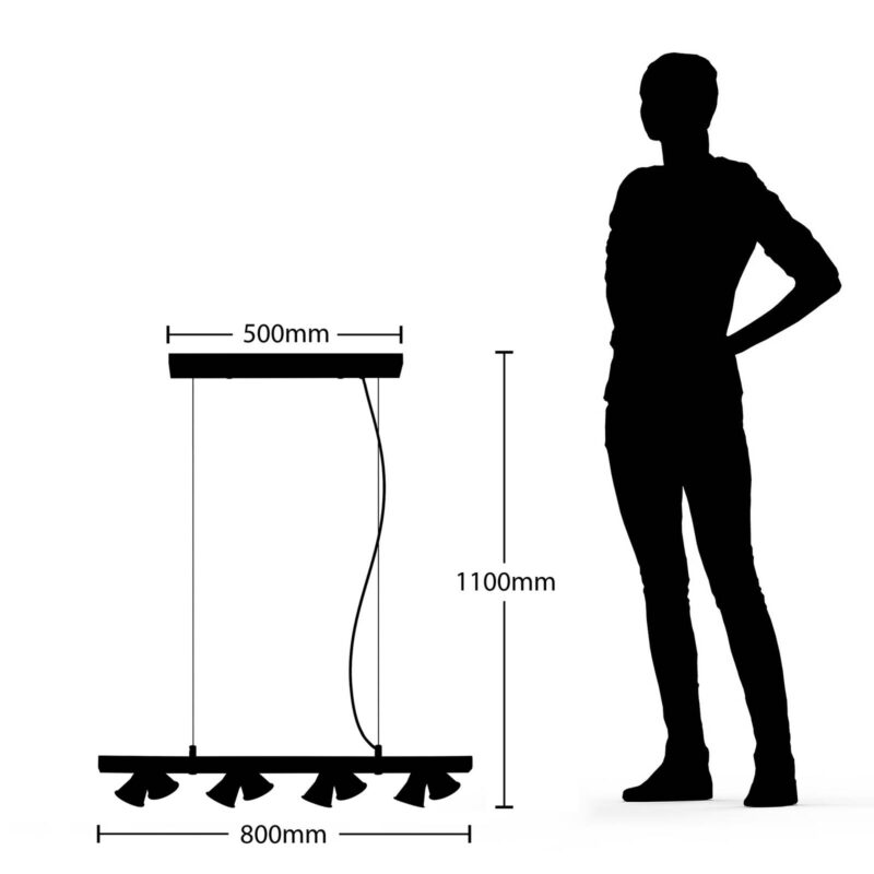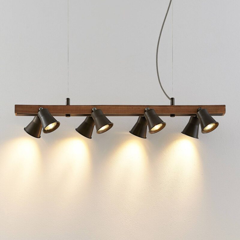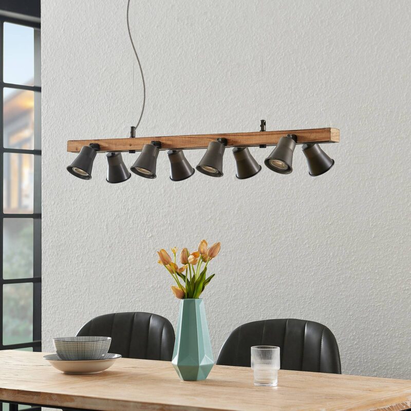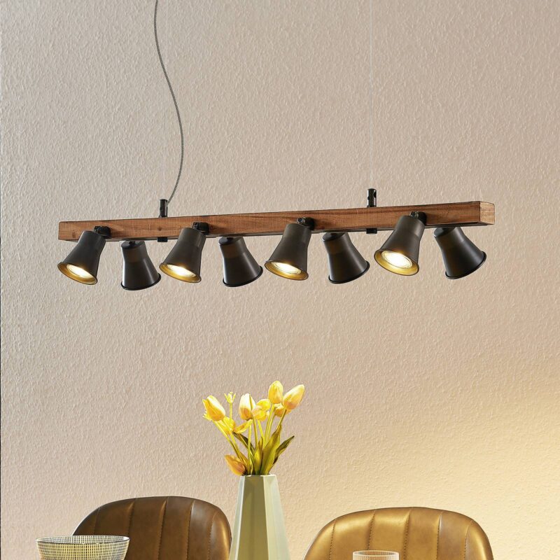 Osem žiarovkové závesné svietidlo Grandesa s dreveným prvkom Na dlhom drevenom prvku závesného svietidla Grandesa je v pároch zoradených osem nastaviteľných kovových reflektorov. Podľa potreby sa dajú otočiť, aby bolo možné meniť nielen svetelné žiarenie, ale aj optiku žiarovky. Odtiene v čiernej povrchovej úprave vytvárajú pekný kontrast s drevom a umožňujú svetlu uniknúť iba otvorom. Môžu byť vybavené žiarovkami GU10 podľa vášho výberu, je možné ovplyvňovať intenzitu svetla a výberom stmievateľných žiaroviek je možné stmievanie pomocou externého stmievača v domovej inštalácii.