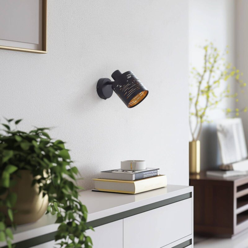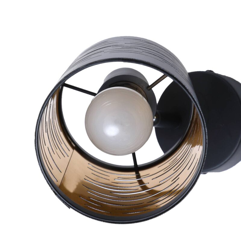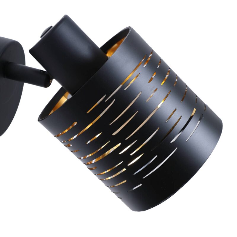 Malé nástenné svietidlo Iolyn s čiernym a zlatým tienidlo na lampu Nástenné svietidlo Iolyn, ktoré je vybavené malým vypínačom priamo na nástennom držiaku, je možné ideálne použiť ako lampu na čítanie alebo nocne svetlo . Dá sa zapnúť alebo vypnúť priamo zo sedenia alebo ľahu. Iolyn je opticky elegantná a moderná. tienidlo na lampu má malé prelamované plochy, ktoré nenápadne odhaľujú interiér. Pretože táto časť je zvnútra opatrená zlatou farbou a zvonka klasickou čiernou, poskytujú tieto oblasti špeciálny vzhľad, ktorý sa prejaví pri zapnutí svetla.