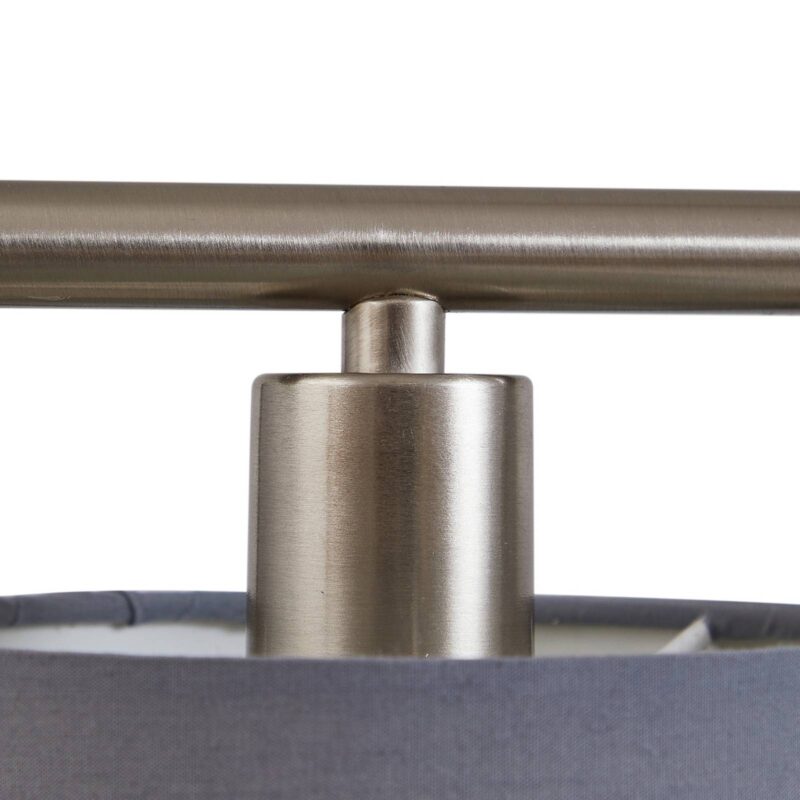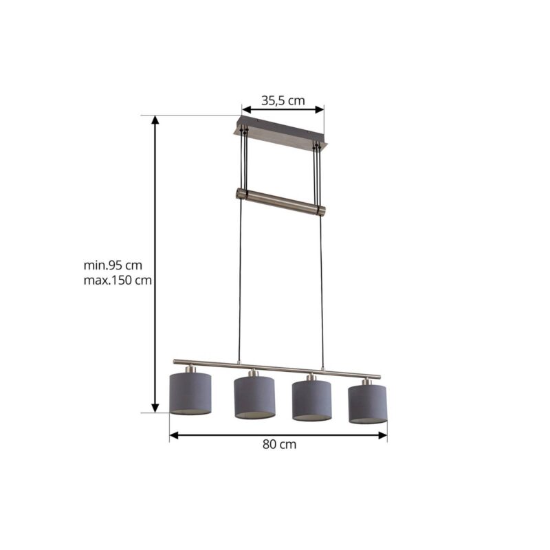Dokonalé osvetlenie stola – závesná lampa Jorin s textilnými tienidlami Moderná závesná lampa Jorin je ideálna nad dlhým jedálenským stolom. Pozostáva z rámu z matného niklu a štyroch svetelných zdrojov, ktoré visia vedľa seba v tvare malých textilných tienidiel v decentnej sivej farbe. V každej z nich sa nachádza objímka E14, ktorá môže byť osadená preferovaným zdrojom svetla. Výškovým nastavením svietidla sa zaisťuje aj optimálne osvetlenie, ktoré je možné nastaviť jednoduchým mechanizmom od 95 cm do 150 cm.