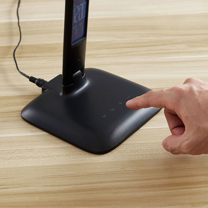 Čierna, stmievateľná multifunkčná LED lampa na písací stôl Ludmilla s digitálnym displejom, funkciou striedania farbieb, teplomerom a USB portom V LED lampe na písací stôl Ludmilla sa spájajú rôzne funkcie, čo z nej robí pekný zdroj osvetlenia vhodný na súkromné pracovisko. Integrované kĺbové spoje umožňujú presné nasmerovanie svetla a nenápadný čierny povrch sa dá dobre skombinovať s množstvom rozličných prostredí. Lampa má dotykový ovládač, ktorý umožňuje stupňovité nastavenie jasu aj farby svetla. Vďaka tomu sa dá osvetlenie písacieho stola lepšie prispôsobiť rozličným situáciám a vy si môžete zvoliť druh svetla, ktoré vytvorí buď príjemnú atmosféru alebo skôr prostredie vhodné na sústredenú prácu. Pokiaľ nik nevytiahne zástrčku zo siete, ostanú zvolené nastavenia vďaka pamäťovej funkcii zachované aj pri nasledujúcom zapnutí svietidla. Na displeji v strednej časti lampy sa nezobrazuje len čas a dátum, ale aj teplota v miestnosti. Svietidlo navyše disponuje aj funkciou alarmu. USB port integrovaný v podstavci slúži na rýchle a pohodlné nabíjanie elektrických zariadení, napr. smartfónov. Poznámka: displej si vyžaduje batériu (CR2032), ktorá je súčasťou dodávky.