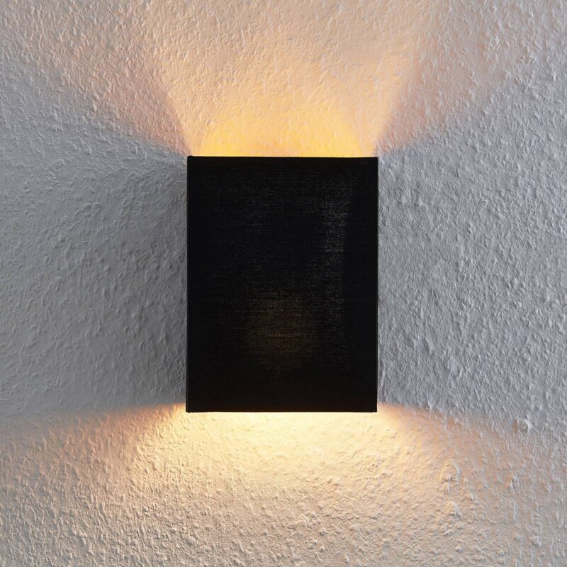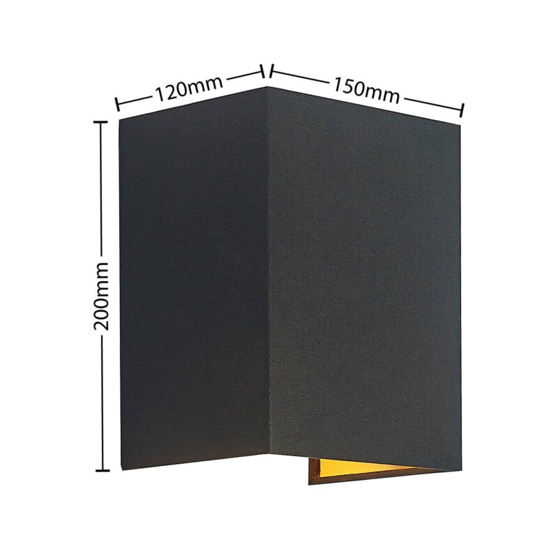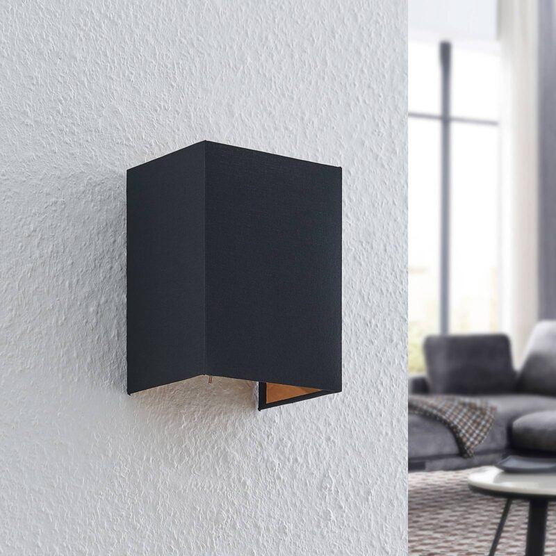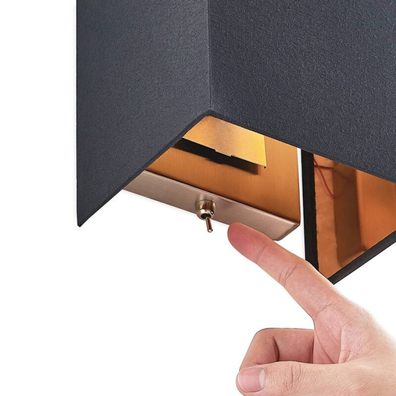 Štvorcové nástenné svietidlo Lukani v tmavom prevedení Lukani je špeciálne nástenné svietidlo, ktoré svojim tmavým tienidlom priťahuje pozornosť všetkých. Bol vyrobený z ocele a textilu, s vnútorným čiernym textilným tienidlom pokrytým zlatou fóliou. To zaisťuje teplé svetelné efekty a dochucuje dizajn. Svetlo je emitované smerom hore a dole, aby nedochádzalo k oslneniu. Výberu svetelného zdroja pre päticu E27 sa medze nekladú, obzvlášť vhodný je energeticky úsporný svetelný zdroj LED s moderným vzhľadom vlákien.