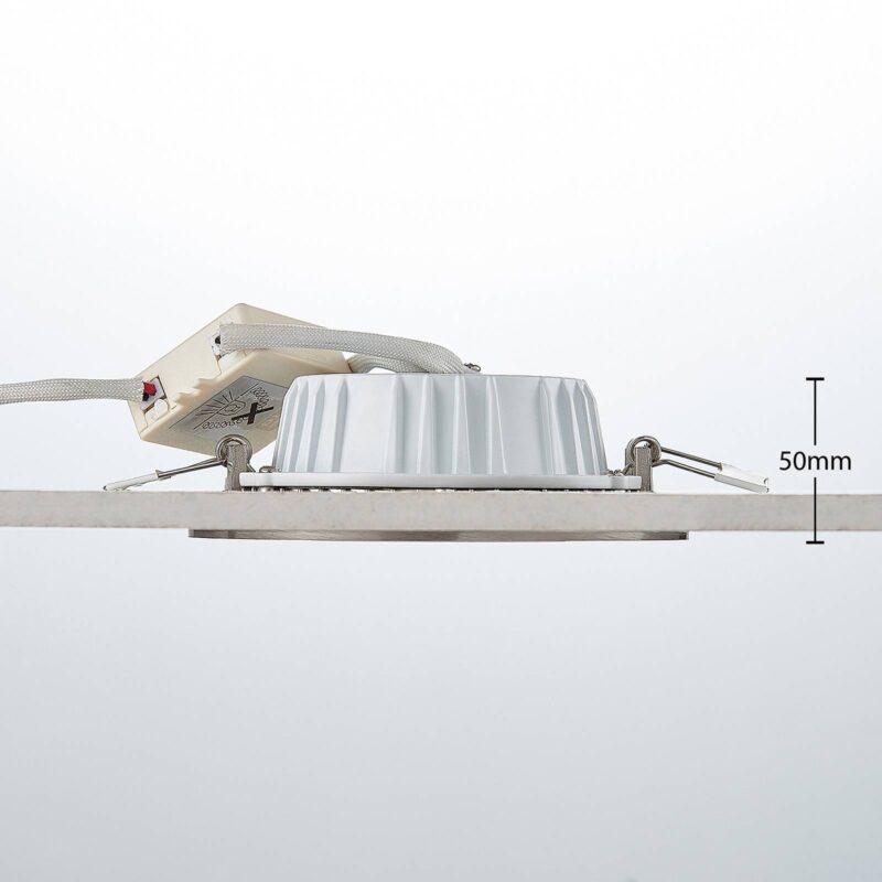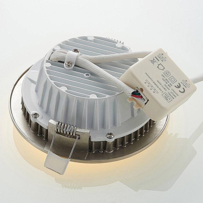 Okrúhle zapustené LED svietidlo Noor s niklovo sfarbeným rámom a RGBW svetlom Na prvý pohľad sa lampa Noor javí ako jednoduchá a nadčasová a na druhý pohľad odhaľuje svoje osobitné vlastnosti. Uprostred je umiestnená výkonná COB dióda LED, ktorá vytvára teplé biele svetlo, zatiaľ čo prstencová plocha svietidla okolo LED zaisťuje svetlo RGB a svieti vo farbách červená, zelená a modrá. Na prevádzku svietidla postačuje bežný nástenný vypínač, prostredníctvom ktorého je možné svietidlo prepínať celkom v siedmich režimoch, takže tri pestré farebné odtiene sa zapínajú buď samostatne, alebo spolu s teplým bielym svetlom. Centrálna LED v teplej bielej farbe sa dá samozrejme zapnúť aj na každodenné použitie bez farebného svetla, ktoré zdobí atmosféru. Vďaka pamäťovej funkcii sa zachová posledný zvolený režim, až kým sa znovu nezapne zapustené LED svietidlo.