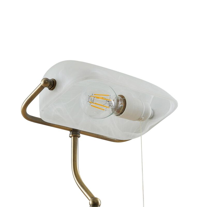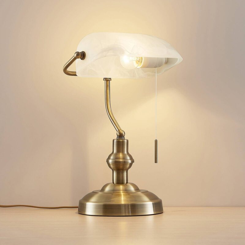 Stolná lampa Profina navrhnutá v bankárskom štýle – optimálny zdroj svetla na pracoviskoStolná lampa Profina bola navrhnutá ako klasická bankárska lampa, ktorá svojím osobitým vzhľadom pôsobí nostalgicky a zároveň štýlovo. Bankárska lampa má svoj pôvod na začiatku minulého storočia, kde sa vyskytovala najmä v bankách, knižniciach a advokátskych kanceláriách.vďaka zakrivenému tienidlu z bieleho opálového skla vyžaruje svetlo najmä smerom nadol, takže pracovná plocha pri stole je dobre osvetlená a okolie zostáva bez oslnenia. Na svietidle je umiestnený praktický ťahový vypínač, takže ovládanie zostáva pre používateľa jednoduché a pohodlné.