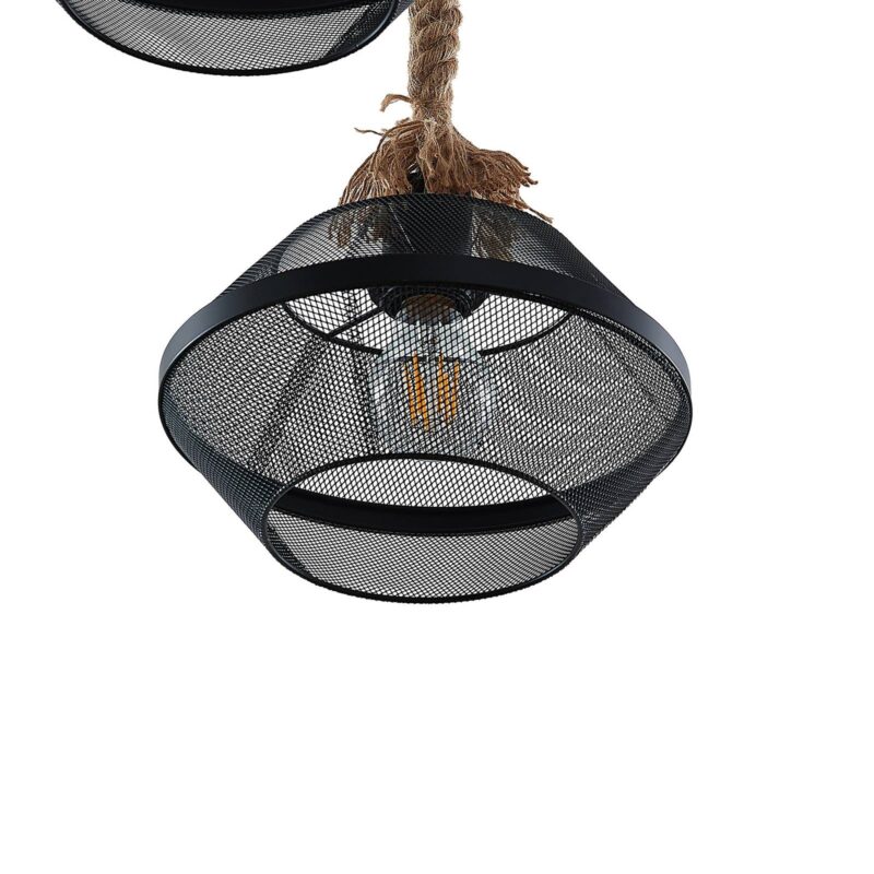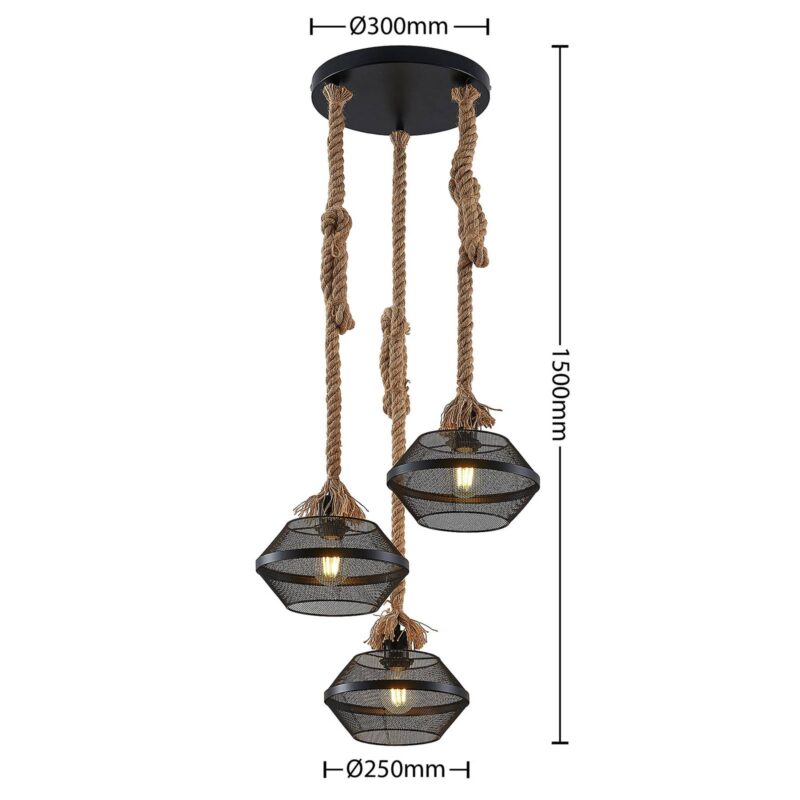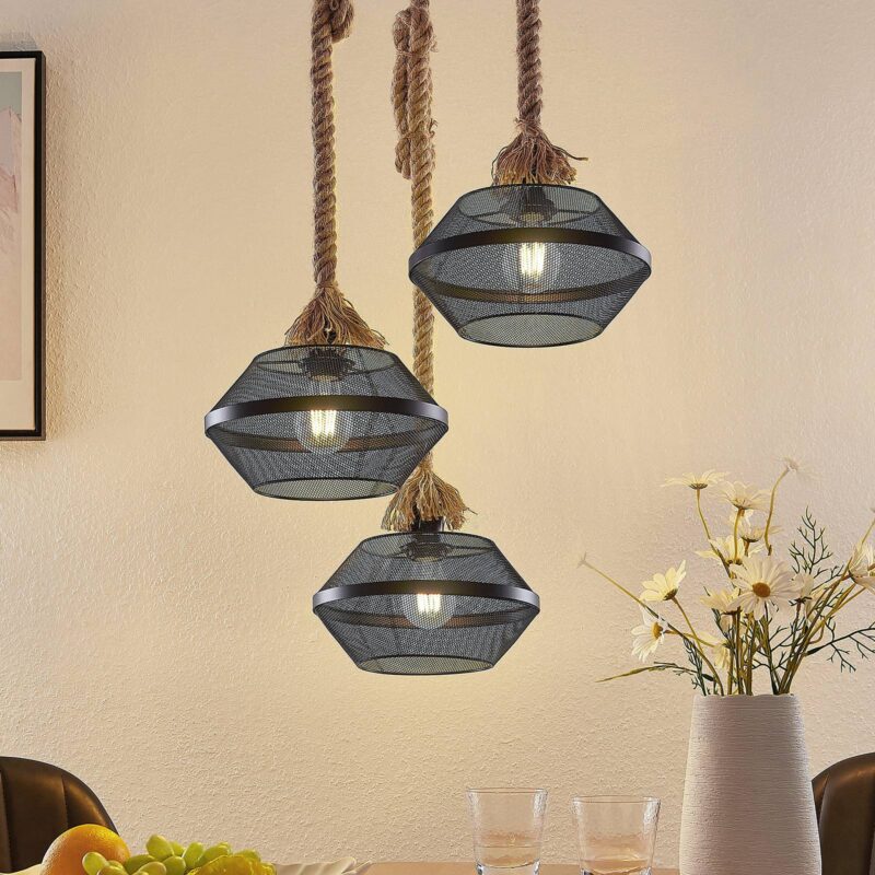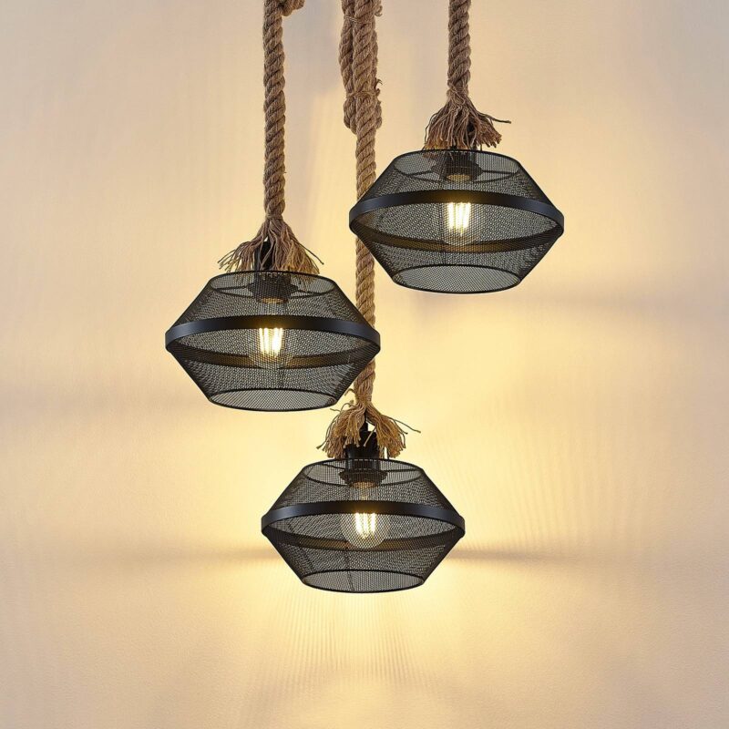 Zviazaná závesná lampa Rabia so zavesením z konopného lana Závesná lampa Rabia púta pozornosť všetkých. Na jeho stropnej konzole sú pripevnené tri laná z konopného lana, každé z nich má tienidlo, ktoré vyzerá ako klietka. Pre špeciálny efekt boli dáždniky pripevnené k lanám rôznych dĺžok, a preto sú pripevnené po etapách. Svetlo generované použitými žiarovkami sa láme cez medzery na obrazovkách a vytvára vzrušujúcu hru svetla. Vďaka zaujímavému vzhľadu závesné svietidlo Rabia robí z každej miestnosti niečo veľmi zvláštne. Svojim rustikálnym a rozmanitým dizajnom benevolentne vylepšuje každý štýl zariaďovania a je presvedčivým dekoratívnym predmetom.