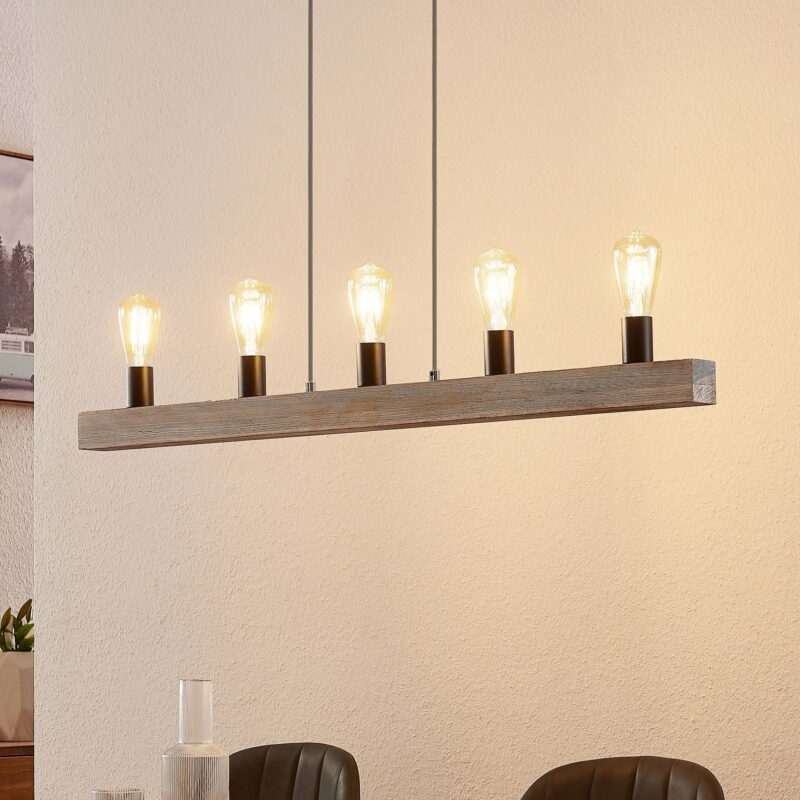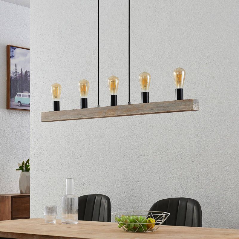 Závesná lampa Relia s lúčom z borovicového dreva Závesné svietidlo Relia zaujme svojím prírodným dizajnom, ktorý sa niekedy vyznačuje nádychom moderného vkusu. Krásny borovicový lúč upúta pozornosť a okamžite dodá miestnosti útulný efekt. Na lúči je päť svetelných bodov v rade. Pretože má divák jasný výhľad na svetelné zdroje, odporúčajú sa dekoratívne žiarovky s vláknovým vzhľadom alebo nádherné rustikálne žiarovky, ktoré zdôrazňujú osobitný charakter žiarovky. Pomocou stmievateľných žiaroviek a bežného stenového stmievača je možné jas Relia nastaviť v krátkom čase podľa vašich požiadaviek.