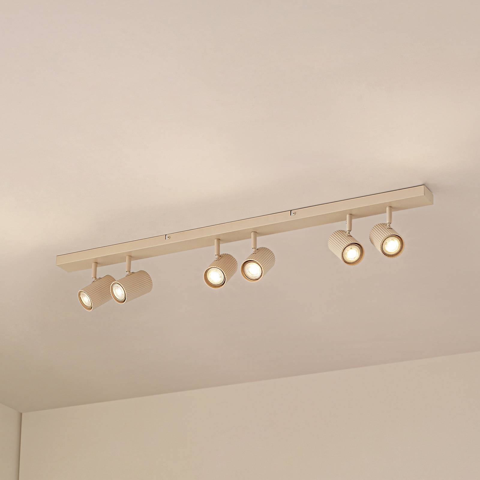 6-plameňové, nastaviteľné stropné svietidlo Kardis – použiteľné aj ako nástenné svietidlo 6-plameňové bodové svetlo Kardis zaujme moderným dizajnom a použitými materiálmi. Hliník v decentnej béžovej farbe sa bezproblémovo hodí do rôznych štýlov interiéru a dodáva štýlové akcenty do predsiení a obývacích izieb. Konštrukcia zaisťuje rovnomerné osvetlenie a vytvára príjemnú atmosféru, ktorú vďaka pohyblivým tienidlám na lampy možno nasmerovať presne tam, kde je to potrebné.