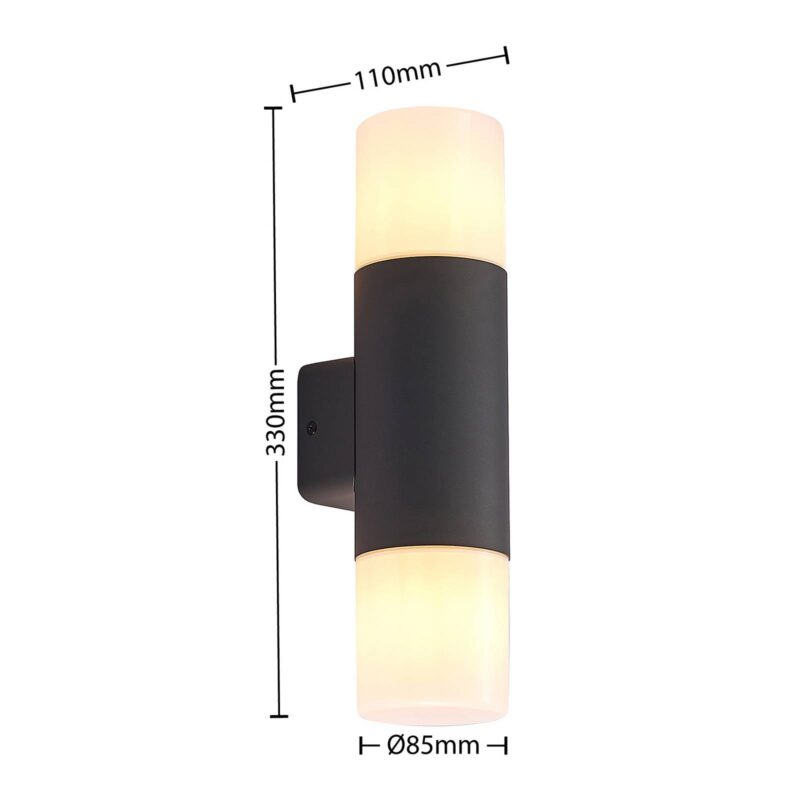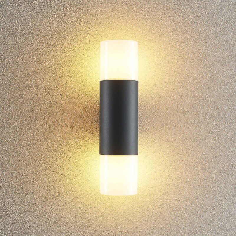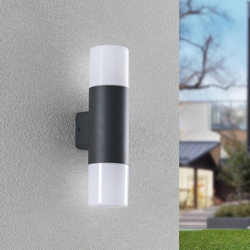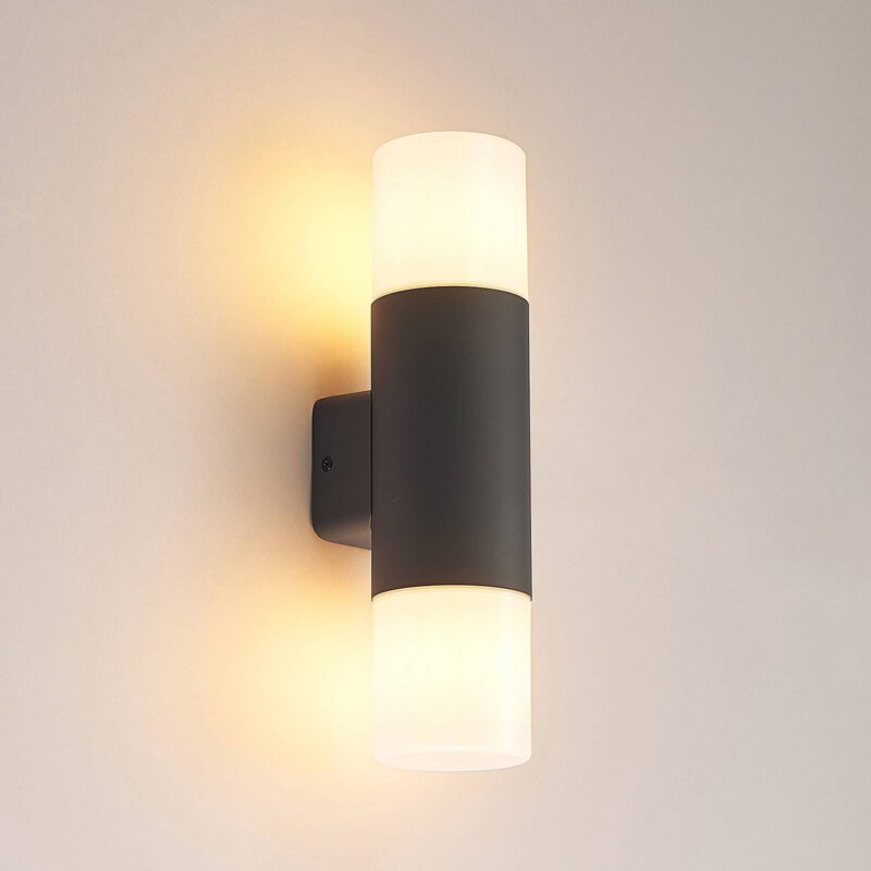 Vonkajšie nástenné svietidlo Tabyn s dvoma zdrojmi svetla Vonkajšie nástenné svietidlo Tabyn sa prezentuje vo svojom dvojplamenovom prevedení a zaujme okamžite. Dva svetelné zdroje sú pripevnené zhora a zdola, aby svietidlo fungovalo ako nepriame svetlo a spodné svetlo. Tienidlá sú vyrobené z bieleho opálového plastu a umožňujú rovnomerné a pohodlné vyžarovanie svetla, aby diváka nebolo možné oslniť. Puzdro je vyrobené z hliníka a má tmavosivú povrchovú úpravu, ktorá je momentálne v móde.