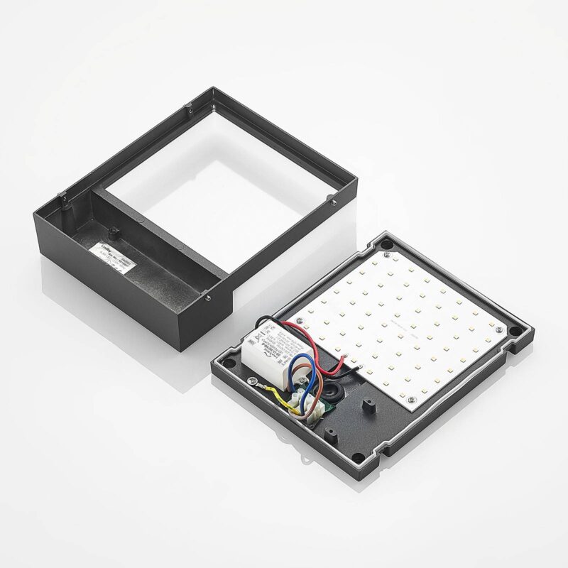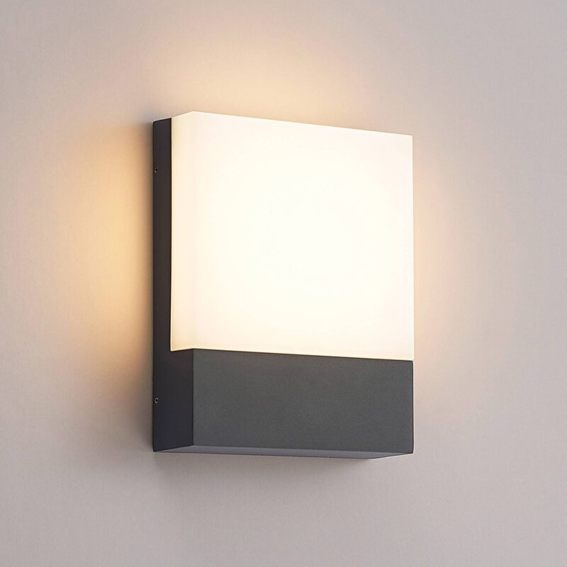 Vonkajšie nástenné LED svietidlo Vanira z tmavošedého hliníka Vonkajšie nástenné svietidlo Vanira LED má jasne štruktúrovaný dizajn. Vaše hranaté puzdro z hliníka, zatiaľ čo jej opálové biele tienidlo na lampu je vyrobené z plastu. Funguje tiež ako difúzor a umožňuje svetlu jemne a rovnomerne unikať. Toto osvetlenie bez oslnenia funguje dobre vo vstupnej hale alebo na terase. Teplé biele svetlo je príjemné a príjemné. Dážď a vietor nemôžu poškodiť svietidlo, pretože je dobre chránený proti poveternostným podmienkam vďaka triede ochrany IP54