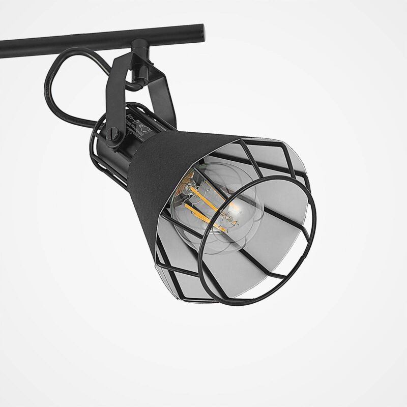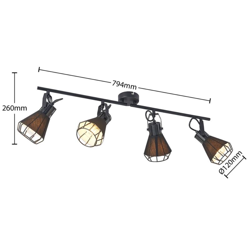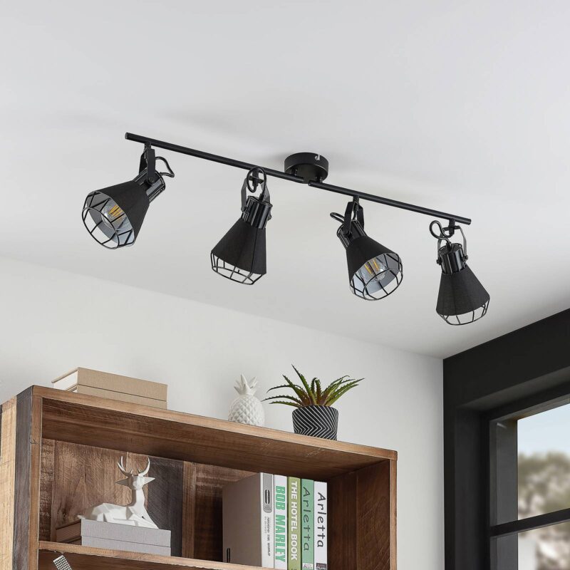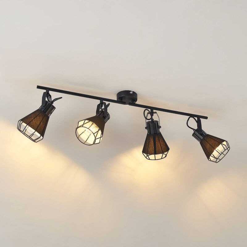 Bodové svietidlo Yusei so štyrmi plameňmi v rustikálnom dizajne zo železa a látky Priestranný reflektor Yusei je ideálny pre veľké miestnosti a generuje rozsiahle osvetlenie. Skladá sa z okrúhlej stropnej konzoly, ku ktorej je vodorovne pripevnená štíhla vzpera, ktorá nesie štyri tienidlá. Každý z týchto odtieňov je obklopený čiernou látkou a môže byť vybavený žiarovkami E27. Jednoduchá čierna farebná schéma dodáva robustnému dizajnu žiarovky istý pokoj a umožňuje jej ľahkú integráciu do štýlu vybavenia. Z tohto dôvodu sa v reflektore Yusei odporúča použiť žiarovku, aby sa zdôraznil jej zvláštny vzhľad.