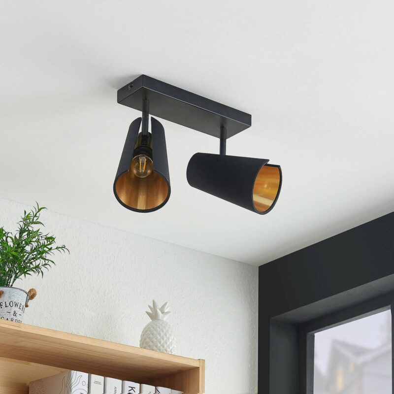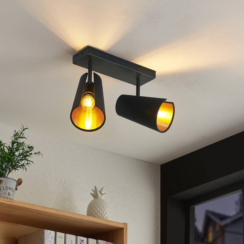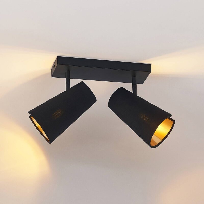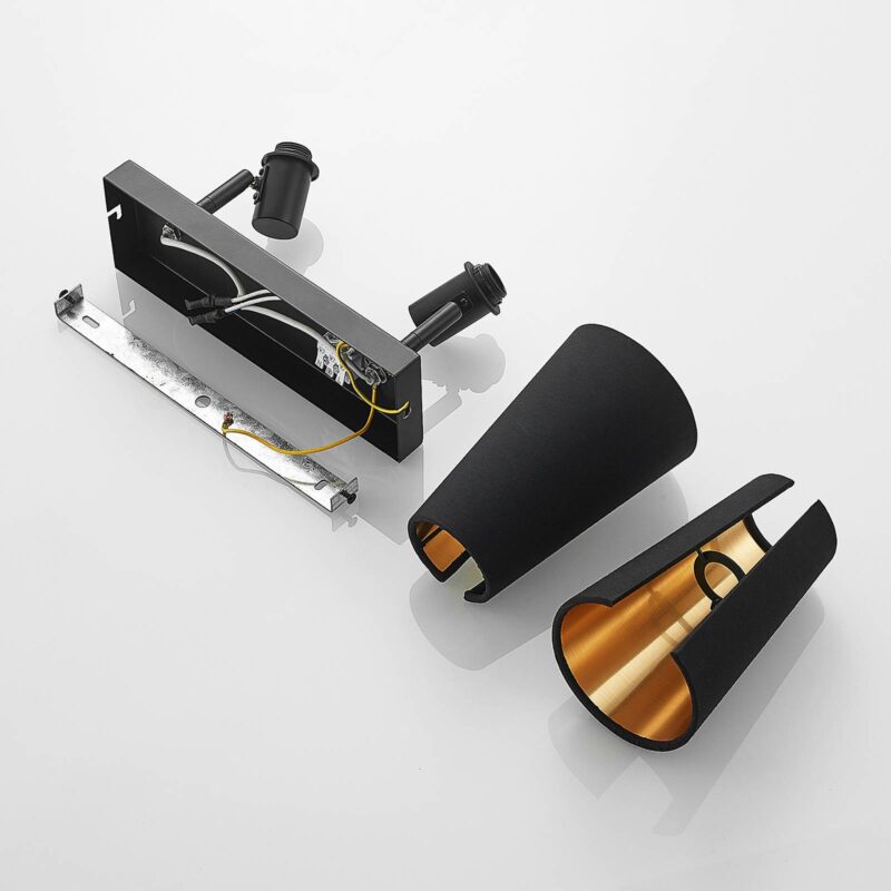 Dvojsvetelné stropné svietidlo Zylindro so zaujímavo riešenými tienidlami Dve čierne textilné tienidlá so zlatou vnútornou stranou potiahnutou PVC boli pripevnené k oceľovému baldachýnu obdĺžnikového tvaru. Ich otváranie na dlhšej strane z nich robí pútavý prvok. Tento otvor vytvára špeciálny svetelný efekt v podobe jasného svetelného kužeľa. Zlatý odtieň vnútra dodáva osvetľovaciemu prostriedku teplý lesk. V malých miestnostiach alebo na osvetlenie častí miestnosti možno stropné svietidlo namontovať aj na stenu. Tienidlá stropného svietidla Zylindro sú vybavené päticami E14, do ktorých možno vložiť všetky typy žiaroviek. Zylindro sa stáva moderným energeticky úsporným svietidlom s možnosťou výberu moderných, energeticky úsporných LED žiaroviek s dlhou životnosťou (nie sú súčasťou dodávky – pozri príslušenstvo).