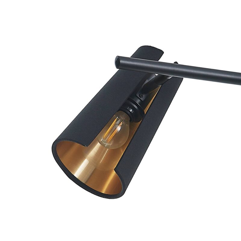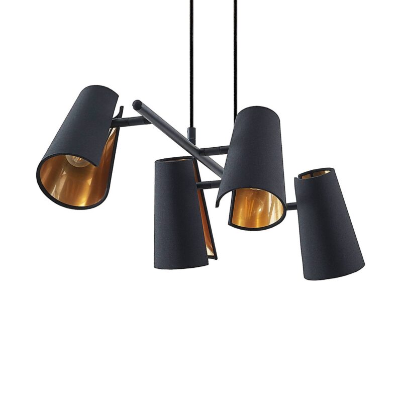 Štvorsvetelné závesné svietidlo Zylindro s čierno-zlatými textilnými tienidlami Výrazným prvkom závesného svietidla Zylindro sú štyri tienidlá z látky so zlatým vnútrom potiahnutým PVC, ktoré sú po stranách v pároch pripevnené k dlhej tyči svietidla. Vynikajú širokými otvormi po stranách, cez ktoré jasne svieti svetlo, zatiaľ čo cez zvyšok tienidla svieti len jemne. Tienidlá sa dajú otáčať na tyči a možno ich osadiť ľubovoľnou žiarovkou s päticou E14. Svietidlo sa stane energeticky úsporným zdrojom svetla nad stolom v jedálni alebo v kuchyni, ak je vybavené LED žiarovkami.