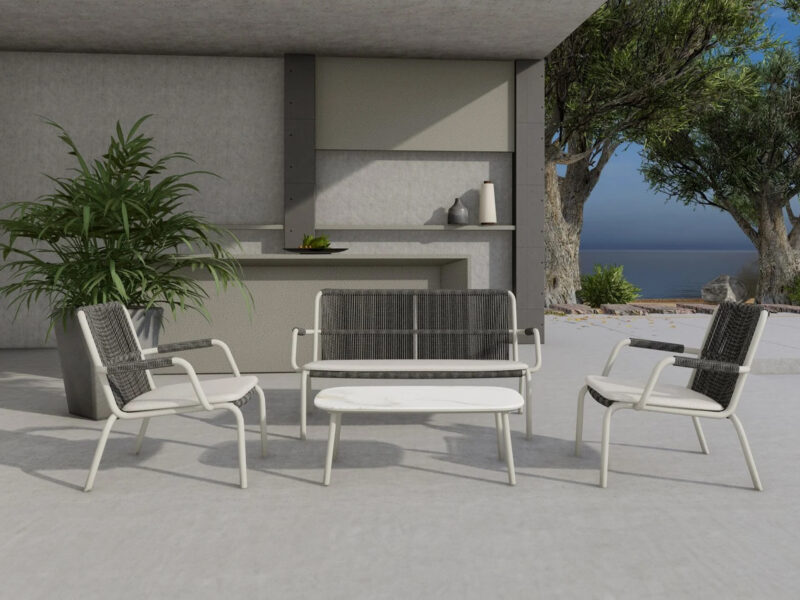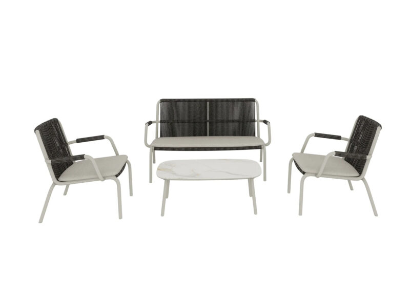 Sedacia súprava Ling vnáša do vášho exteriéru ľahkosť a vzdušnosť. Vďaka prepracovanému šnúrovému detailu na opierkach a kombinácii hliníka s odolnou tkaninou ponúka pohodlie aj štýl. Ideálna pre chvíle relaxu na terase či záhrade.
