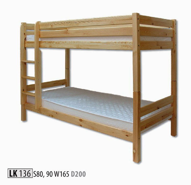 LK136 poschodová posteľ 90 je vhodná do detskej, či hosťovskej izby. Posteľ je vyrobená z masívneho borovicového dreva. Farebné prevedenie: prírodná borovica. Za príplatok ponúkame možnosť namorenia na odtieň jelša, orech a dub. Rošty a matrace nie sú v cene postele. Je možné ich u nás doobjednať. Dodávame v demontovanom stave.