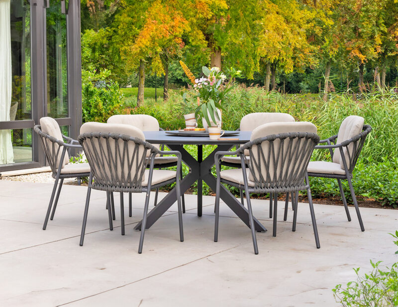 Stolová súprava Locarno Manitoba kombinuje moderný dizajn a funkčnosť. Obsahuje 6 stohovateľných stoličiek Manitoba s hliníkovým rámom, rope výpletom a pohodlnými sedákmi, doplnených o robustný okrúhly stôl Locarno s HPL doskou a stabilnou hliníkovou konštrukciou.