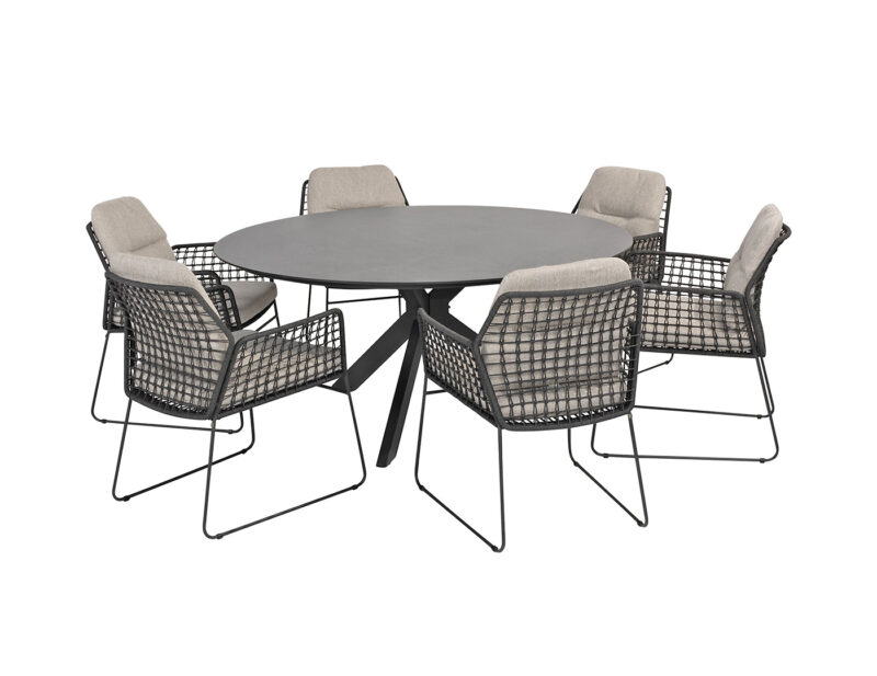 Stolová súprava Locarno Rhodos (1+6) kombinuje moderný dizajn a kvalitné materiály. Stôl Locarno s odolnou HPL doskou a hliníkovou konštrukciou dopĺňa 6 stoličiek Rhodos s oceľovým rámom a rope výpletom pre maximálny komfort.