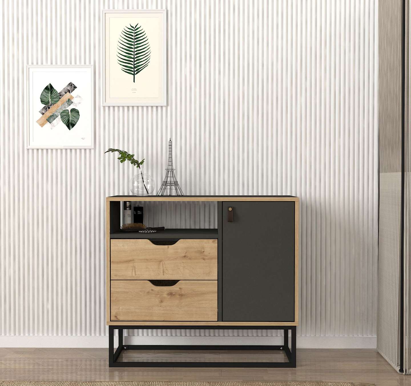Komoda LORESPredstavujeme vám štýlovú a praktickú komodu LORES, ktorá je ideálnym doplnkom pre vašu obývaciu izbu alebo spálňu. Táto komoda kombinuje moderný dizajn s vysokou funkčnosťou, čo z nej robí skvelú voľbu pre každý interiér.Špecifikácia produktu:Typ tovaru: KomodaVhodné do miestnosti: Obývacia izba a spálňaMateriál: LTD a kovRozmer: 90 x 80 x 35 cmFarba: Antracit + svetlo hnedáVybavenie: 2 zásuvky, skrinka a regálPočet dvierok: 1 dverovéHrúbka materiálu: 18 mmDodatočné informácie: Dodávame v demonte.Komoda LORES sa vyznačuje elegantným antracitovým prevedením kombinovaným so svetlo hnedými detailmi, ktoré dodávajú nábytku moderný a atraktívny vzhľad. S dvoma zásuvkami, skrinkou a regálkom ponúka dostatok úložného priestoru pre všetky vaše potreby. Kovové prvky dodávajú komode na odolnosti a štýle.Vďaka materiálu LTD s hrúbkou 18 mm je táto komoda robustná a trvanlivá, čo zaručuje jej dlhú životnosť. Komoda LORES je dodávaná v demonte, takže si môžete užiť radosť z jej ľahkého zostavenia.Vylepšite svoju obývaciu izbu alebo spálňu s komodou LORES a pridajte do svojho domova štýlový a funkčný kus nábytku. Objednajte si ju ešte dnes a užite si praktické a elegantné úložné riešenie.