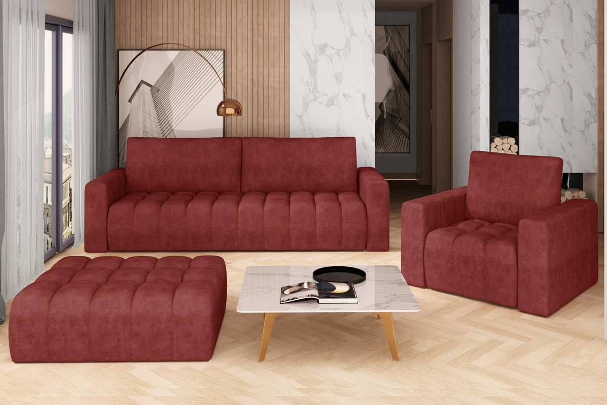 Sedacia súprava LOSIKA vás zaujme svojou eleganciou a štýlovým prevedením. Táto moderná zostava sa skladá z troch atraktívnych prvkov, ktorými sú: pohovka, kreslo a taburetka. Pohovka je vyplnená kvalitnou HR penou v kombinácii s PUR penou o hustote T2540. Disponuje praktickým úložným priestorom. Je tiež rozkladacia. Spacia plocha: 195 x 125 cm. Je vhodná na príležitostné spanie.Rozmery pohovky (š,v,h): 245 x 85 x 97 cm. Výška sedadla: 40 cm. Výška nožičiek: 3 cm. Kreslo je vyplnené vlnovcovou pružinou v kombinácii s HR a PUR penou o hustote T2130. Rozmery kresla (š,v,h): 108 x 85 x 89 cm. Výška sedadla: 40 cm. Výška nožičiek: 3 cm. Taburetka je vyplnená tiež vlnovcovou pružinou v kombinácii s HR a PUR penou o hustote T2130. Rozmery taburetky (š,v,h): 102 x 40 x 64 cm. Výška nožičiek: 3 cm. Sedacia zostava LOSIKA je čalúnená kvalitnou poťahovou látkou Dora 63.V našej ponuke nájdete aj ďalšie farebné prevedenia zostavy LOSIKA. Sedaciu zostavu máme v ponuke len ako celok.
