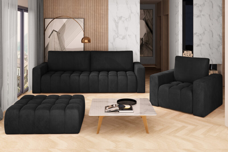 Sedacia súprava LOSIKA vás zaujme svojou eleganciou a štýlovým prevedením. Táto moderná zostava sa skladá z troch atraktívnych prvkov, ktorými sú: pohovka, kreslo a taburetka. Pohovka je vyplnená kvalitnou HR penou v kombinácii s PUR penou o hustote T2540. Disponuje praktickým úložným priestorom. Je tiež rozkladacia. Spacia plocha: 195 x 125 cm. Je vhodná na príležitostné spanie.Rozmery pohovky (š,v,h): 245 x 85 x 97 cm. Výška sedadla: 40 cm. Výška nožičiek: 3 cm. Kreslo je vyplnené vlnovcovou pružinou v kombinácii s HR a PUR penou o hustote T2130. Rozmery kresla (š,v,h): 108 x 85 x 89 cm. Výška sedadla: 40 cm. Výška nožičiek: 3 cm. Taburetka je vyplnená tiež vlnovcovou pružinou v kombinácii s HR a PUR penou o hustote T2130. Rozmery taburetky (š,v,h): 102 x 40 x 64 cm. Výška nožičiek: 3 cm. Sedacia zostava LOSIKA je čalúnená kvalitnou poťahovou látkou Mat Velvet 99.V našej ponuke nájdete aj ďalšie farebné prevedenia zostavy LOSIKA. Sedaciu zostavu máme v ponuke len ako celok.