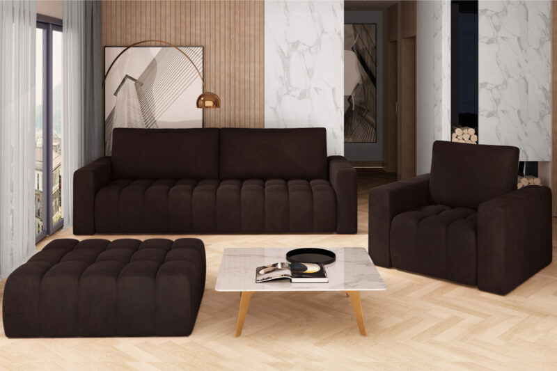 Sedacia súprava LOSIKA vás zaujme svojou eleganciou a štýlovým prevedením. Táto moderná zostava sa skladá z troch atraktívnych prvkov, ktorými sú: pohovka, kreslo a taburetka. Pohovka je vyplnená kvalitnou HR penou v kombinácii s PUR penou o hustote T2540. Disponuje praktickým úložným priestorom. Je tiež rozkladacia. Spacia plocha: 195 x 125 cm. Je vhodná na príležitostné spanie.Rozmery pohovky (š,v,h): 245 x 85 x 97 cm. Výška sedadla: 40 cm. Výška nožičiek: 3 cm. Kreslo je vyplnené vlnovcovou pružinou v kombinácii s HR a PUR penou o hustote T2130. Rozmery kresla (š,v,h): 108 x 85 x 89 cm. Výška sedadla: 40 cm. Výška nožičiek: 3 cm. Taburetka je vyplnená tiež vlnovcovou pružinou v kombinácii s HR a PUR penou o hustote T2130. Rozmery taburetky (š,v,h): 102 x 40 x 64 cm. Výška nožičiek: 3 cm. Sedacia zostava LOSIKA je čalúnená kvalitnou poťahovou látkou Monolith 29.V našej ponuke nájdete aj ďalšie farebné prevedenia zostavy LOSIKA. Sedaciu zostavu máme v ponuke len ako celok.