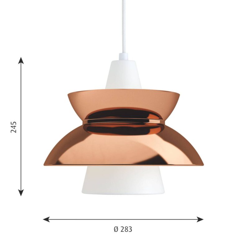 Dizajnová závesná lampa Doo-Wop – nadčasová klasika v lesklej medi Táto prívesná lampa je skutočným veteránom medzi dizajnérskymi žiarovkami od Louis Poulsen . Doo-Wop je založený na dizajne, ktorý bol vytvorený v spolupráci s dánskym námorníctvom okrem iného na vybavenie ich administratívnych a spoločenských miestností. Z tohto pôvodu pochádza označenie svetelného zdroja ako „závesná lampa námorníctva“. Na jednej strane sa tienidlo na lampu skladá z vnútornej vrstvy, ktorej kužeľovitý tvar, otvorený dole, vyžaruje priame svetlo do oblasti pod. Mierne priesvitný materiál vytvára aj nepriamu svetelnú zložku. Existuje aj vonkajšia vrstva, ktorá sa rozširuje hore a dole z centrálneho pása ako vertikálne ležiace jo-jo. Pozostáva z nakreslenej nelakovanej medi, ktorej červenkastý tón a lesklý povrch dodajú žiarovke hrejivý a elegantný nádych.