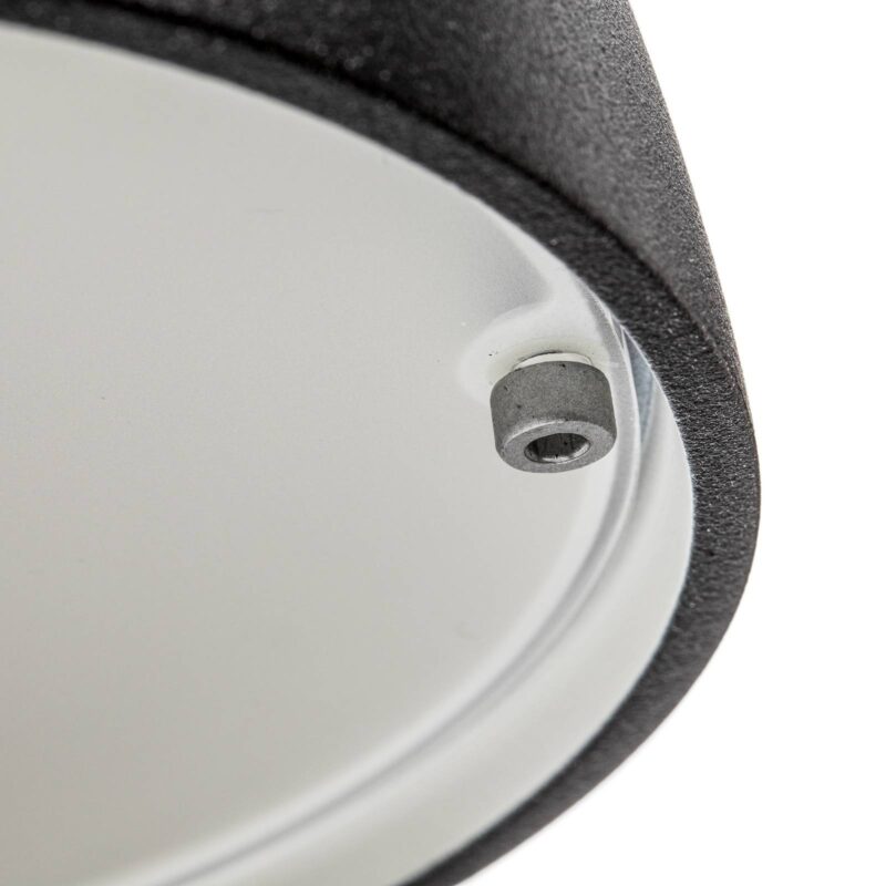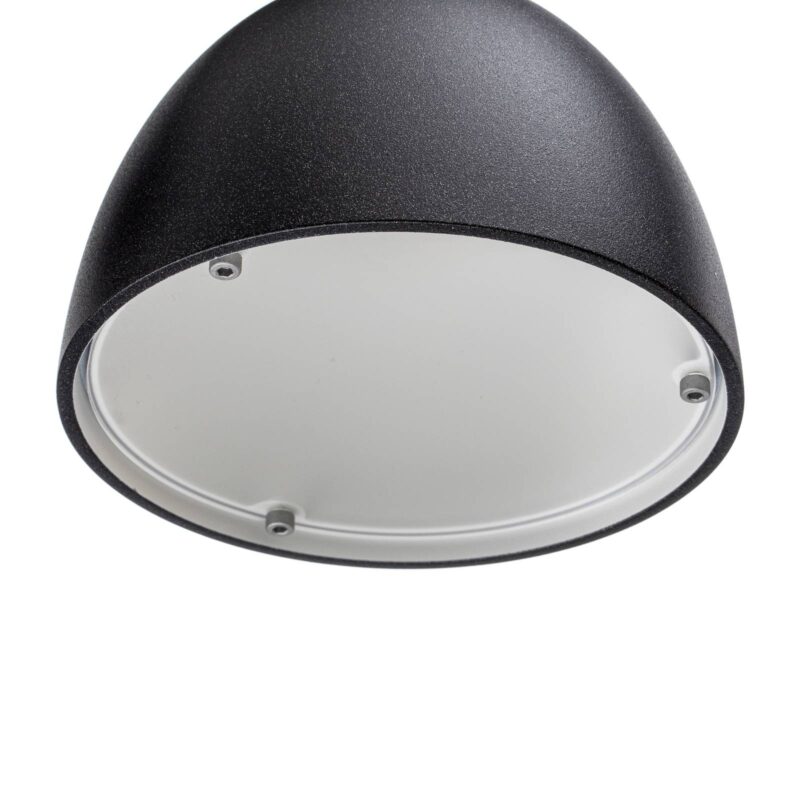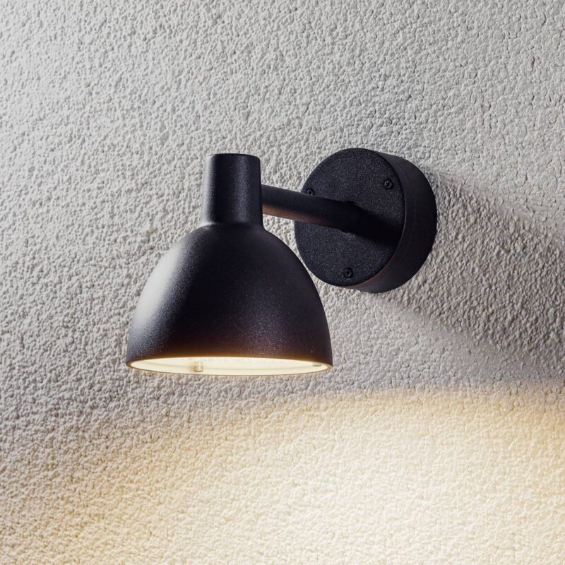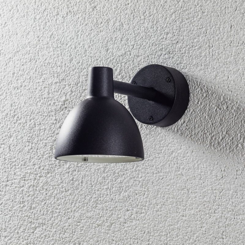 Vonkajšie nástenné svietidlo Toldbod svietiace smerom nadol v matnej čiernej farbe Či už ako akcent na dlhej fasáde alebo ako orientačná pomôcka vo vstupnom priestore – vonkajšie nástenné svietidlo Toldbod od renomovaného dánskeho výrobcu svietidiel Louis Poulsen presvedčí mäkkým, smerom nadol smerujúcim svetlom. Na tento účel je kupolovité tienidlo vybavené laserom vyrezávaným krytom zo saténového akrylu, ktorý rovnomerne rozptyľuje svetlo žiarovky E14, ktorá sa zaň vloží. Toldbod je doplnený o nosné rameno v tvare tyče a okrúhlu nástennú konzolu a je vyrobený z hliníka. – Odolnosť proti nárazu: IK05