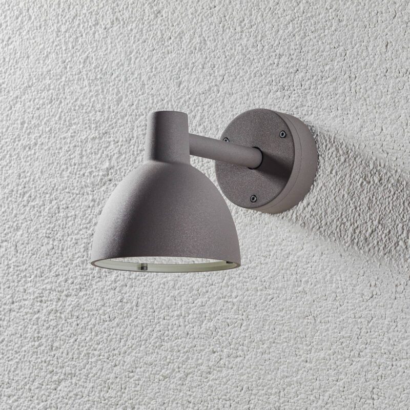Vonkajšie nástenné svietidlo Toldbod svietiace smerom nadol v matnom hliníkovom vyhotovení Toldbod je vysokokvalitné nástenné svietidlo od dánskeho výrobcu Louis Poulsen, ktorý sa môže pochváliť dlhou tradíciou od roku 1874. Dizajn s okrúhlym nástenným držiakom, tyčovým nosným ramenom a kupolovitým tienidlom orientovaným nadol sa dá kombinovať s rôznymi vonkajšími plochami, napríklad pri vchodoch alebo aj na dlhých stenách. Žiarovka E14 je vložená za laserom vyrezaný disk zo saténového akrylu. V dôsledku toho sa na okolitej podlahe a spodnej časti steny vytvára rozptýlená svetelná plocha. – Odolnosť proti nárazu: IK05
