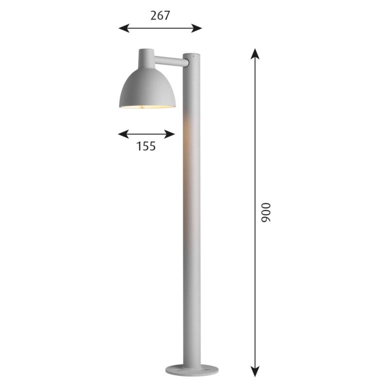 Moderné svetlo na cestu Toldbod s kupolovitým tienidlom Svetlo na cestu Toldbod je vyrobené z hliníka a dodáva sa v jednofarebnom matnom vyhotovení s priehľadným dizajnom. Zvislá zvislá rúrka a horizontálne vyčnievajúce nosné rameno majú tvar valca, zatiaľ čo tienidlo pripomína kupolu, ktorá je v spodnej časti otvorená. Tá je vybavená krytom zo satinovaného akrylu, ktorý vytvára na podlahe rozptýlene osvetlenú plochu. Vysokokvalitný svetelný zdroj od dánskeho výrobcu Louis Poulsen možno použiť na súkromných chodníkoch a príjazdových cestách, ako aj na verejných promenádach a rekreačných oblastiach – Odolnosť proti nárazu: IK05