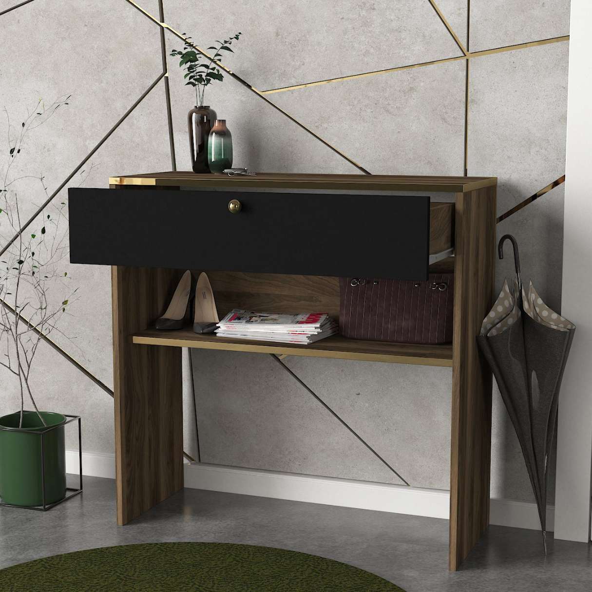 Konzolový stolík LOUISEElegantný a praktický konzolový stolík LOUISE je ideálnym doplnkom pre vašu obývaciu izbu alebo predsieň. Tento štýlový nábytok je vyrobený z kvalitného materiálu LTD a vyniká svojim moderným dizajnom v kombinácii orechovej a čiernej farby.Rozmer: 90 x 90 x 35.5 cmMateriál: LTDFarba: Orech + ČiernaVybavenie: Odkladacie policeTvar: ObdĺžnikovýHrúbka materiálu: 18 mmDodatočné informácie: Dodávame v demonteKonzolový stolík LOUISE ponúka praktickú odkladaciu policu, ktorá je ideálna na uloženie vašich dekorácií, kníh alebo ďalších drobností. Jeho obdĺžnikový tvar a kombinácia orechovej a čiernej farby pridáva do každého interiéru sofistikovaný a moderný vzhľad.Neváhajte a kúpte si konzolový stolík LOUISE ešte dnes. Tento štýlový a funkčný kus nábytku dodá vášmu domovu eleganciu a praktickosť v jednom!