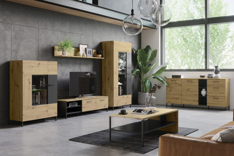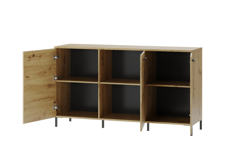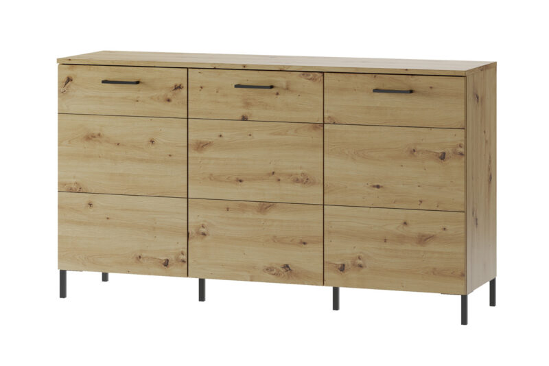 Široká komoda LOVENA je v atraktívnom a štýlovom prevedení. Zaujme aj náročnejších zákazníkov.Je vyrobená z kvalitných LTD dosiek, ktoré sú nenáročné na údržbu. Štýlové úchyty sú v tmavom prevedení. Vyrobené sú z plastu. Moderné nožičky sú vyrobené z kovu. Jej farebné prevedenie je v spojení farieb dub artisan, čierna matná.Komoda je trojdverová. V každej časti sa nachádza jedna polička.Rozmery (š,v,h): 155 x 88 x 42 cm.V našej ponuke sú aj ďalšie prvky LOVENA, vďaka ktorým si vyberiete a poskladáte obývačku či jedáleň podľa vašich predstáv.Dodávame v demontovanom stave.