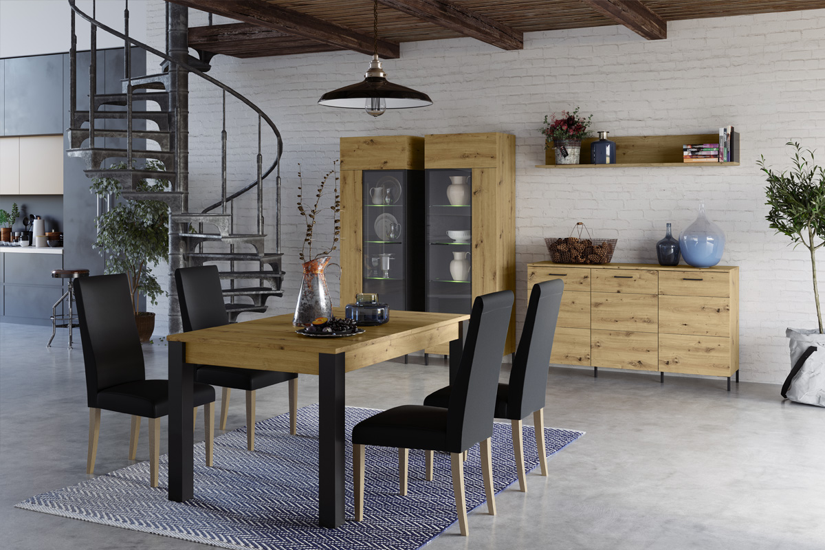 Zostava LOVENA je v atraktívnom a štýlovom prevedení. Zaujme aj náročnejších zákazníkov. Je vyrobená z kvalitných LTD dosiek, ktoré sú nenáročné na údržbu. Štýlové úchyty sú v tmavom prevedení. Vyrobené sú z plastu. Moderné nožičky nábytku sú vyrobené z LTD dosky. Jej farebné prevedenie je v spojení farieb dub artisan, čierna matná. Skladá sa z týchto prvkov: – LOVENA 10 vysoká vitrína ľavá – rozmery (š,v,h): 65 x 193 x 42 cm, – LOVENA 10 vysoká vitrína pravá – rozmery (š,v,h): 65 x 193 x 42 cm, – LOVENA 35 závesná polica – rozmery (š,v,h): 155 x 25 x 27 cm, – LOVENA 36 široká komoda – rozmery (š,v,h): 155 x 88 x 42 cm, – LOVENA 40 rozkladací jedálenský stôl – rozmery (š,v,h): 210/140 x 76 x 90 cm. Celkové rozmery (v,h): 193 x 90 cm. Do vitrín LOVENA 10 je možné dokúpiť LED osvetlenie, ktoré nie je v cene. Dodávame v demontovanom stave.