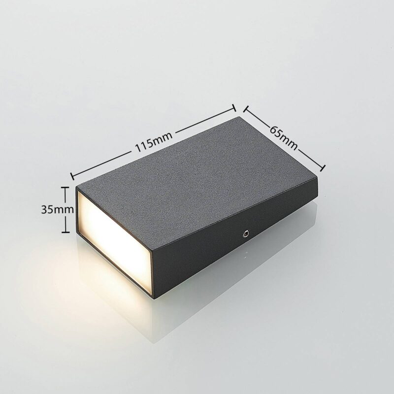 Tmavosivé vonkajšie nástenné LED svietidlo Adarey so svetlom smerujúcim nadol, IP54 Lampa Adarey je osvetľovací prvok v modernom šate určený na vonkajšie použitie. Puzdro svietidla je vyrobené z odliatku hliníka s tmavosivým povrchom a smerom nadol je telo svietidla trochu viac priestrannejšie. Svetlo je nasmerované nadol, a poskytuje tak dobrú orientáciu okolo domu bez akéhokoľvek efektu oslnenia. S úrovňou odolnosti voči nárazom IK10 je vonkajšie nástenné svietidlo s teplými bielymi diódami LED veľmi robustný zdroj svetla, ktorý je dobre vyzbrojený proti vetru a počasiu.