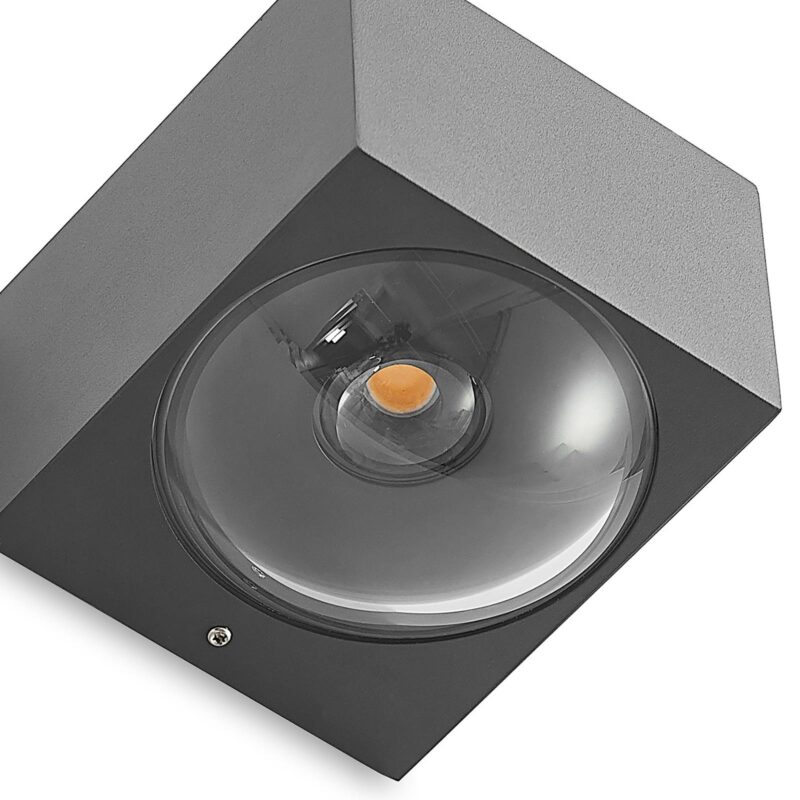 Tmavosivé LED vonkajšie nástenné svietidlo Almos ako moderné svetlo a stropné svietidlo Vonkajšie nástenné svietidlo Almos LED boduje svojim mimoriadnym dizajnom, ktorý je určite pôsobivý. Dva kryty tienidla sú vyrobené zo skla a sú pologuľovité, ktoré zaokrúhľujú hranaté puzdro žiarovky a dodávajú tomuto špeciálnemu vzhľadu o niečo ľahšiu podobu. Zabudovaný LED modul vyžaruje teplé biele svetlo smerom hore a dole, takže na stene domu vznikajú nádherné svetelné efekty. Almos je moderný svetelný zdroj, ktorý vylepšuje svoje okolie a dodáva mu elegantné akcenty. Vďaka triede ochrany IP65 ho možno bez váhania používať dlho v exteriéri.