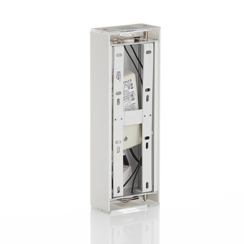LED nástenné svietidlo Anita so satinovaným sklom Obdĺžnikové telo nástenného svietidla Anita je vyrobené z ocele a na oboch koncoch je vybavené LED diódami. Svietidlá distribuujú svoje teplé biele svetlo zo stropu na podlahu. Nad LED diódami sú pripevnené difuzéry vyrobené z lešteného skla, ktoré zaisťujú rovnomerné rozloženie intenzívneho svetla. Svietidlo Anita svojimi geometrickými tvarmi a použitými materiálmi vyzerá moderne, ale vďaka jednoduchému vzhľadu je vhodné pre rôzne zariadenia.