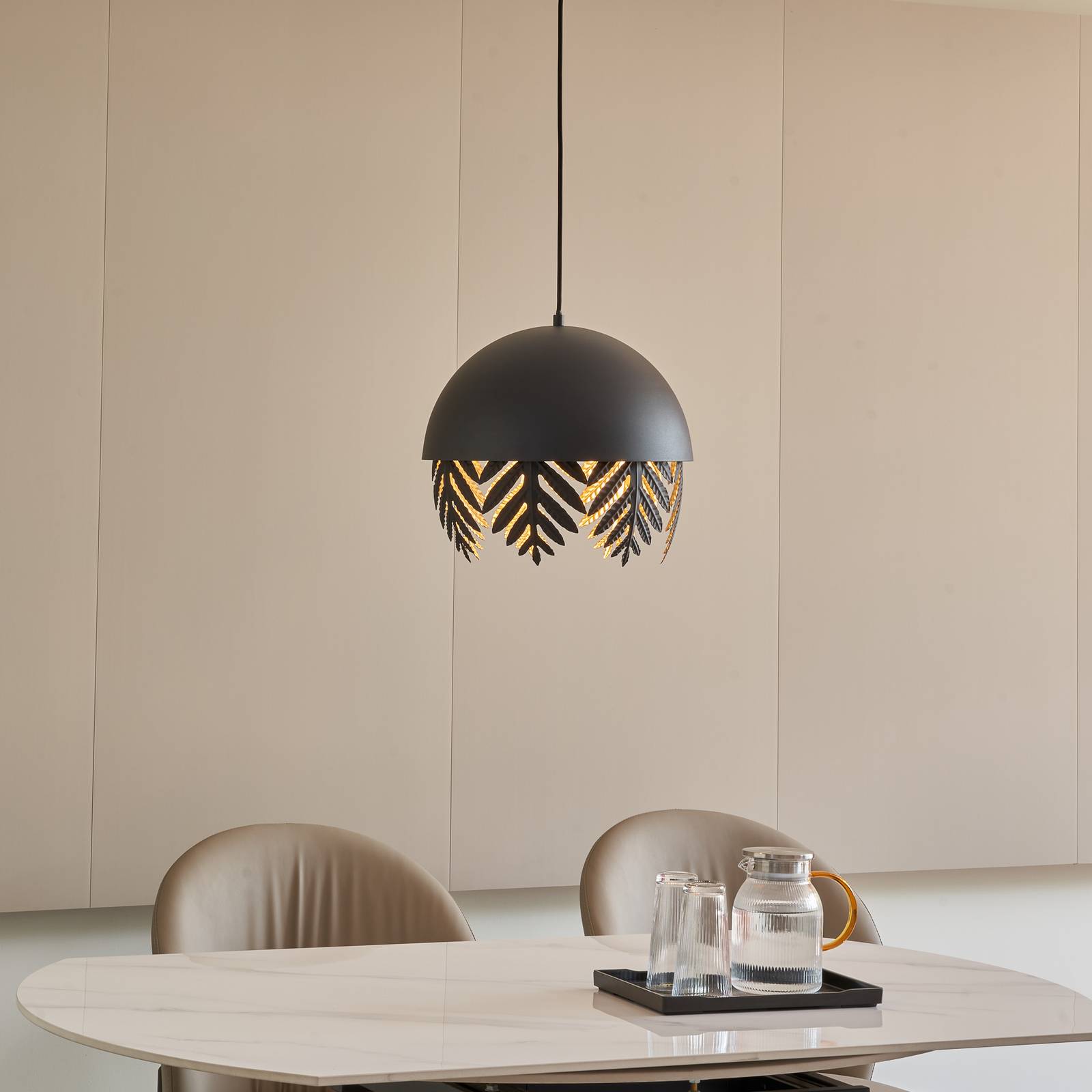 Okrúhle závesné svietidlo Aparas s čiernym listovým tienidlom a zlatým interiérom Aparas zaujme svojím exkluzívnym vzhľadom, pretože ide o dizajnové závesné svietidlo s vysokokvalitnou povrchovou úpravou, ktorá zdôrazňuje špeciálne vlastnosti. Horná časť tienidla je okrúhla ako pologuľa, zatiaľ čo spodnú časť zdobia kovové listy, ktoré pripomínajú listy papradia a majú vejárovitý vzhľad. V kontraste s čiernym vonkajším povrchom má vnútro tienidla zlatú farbu a vytvára v obývačke teplé a útulné svetlo. Záves je potiahnutý textilom, ktorý štýlovo dotvára nezvyčajný vzhľad.