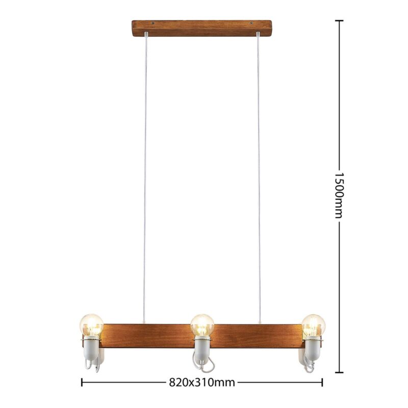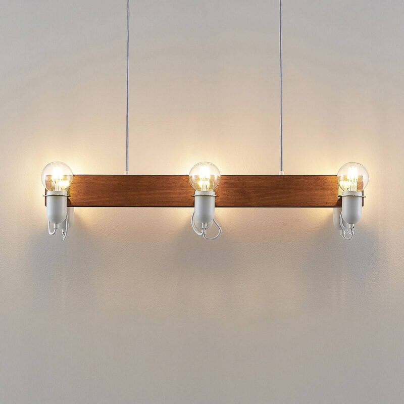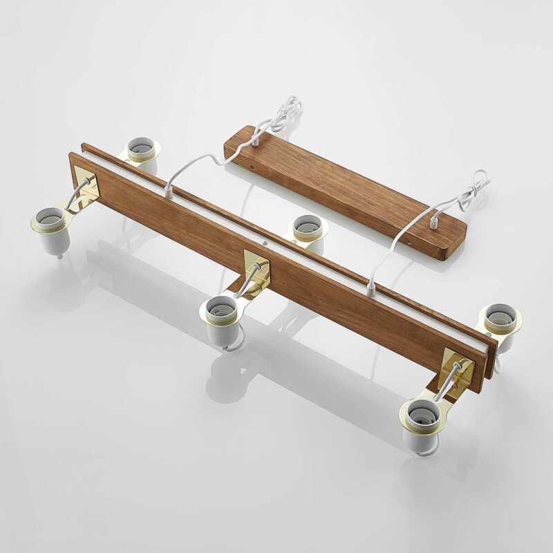 Šesťsvetelné závesné svietidlo Becky s lampami svietiacimi nahor a drevenými trámami v starožitnom vzhľade Becky je svetelný zdroj, ktorý stojí za to vidieť, primárne určený na montáž nad stôl alebo pult. Drevený trám má svetlú starožitnú povrchovú úpravu s mierne tmavším náterom, zatiaľ čo kovové držiaky svietidiel boli všetky natreté na bielo. Ich orientácia je smerom nahor, takže každá používaná lampa vyžaruje svetlo smerom nahor. Na dosiahnutie dokonale tvarovaného vzhľadu a útulného svetla možno zvážiť aj použitie čelových zrkadlových svietidiel, ktoré potom vyžarujú nepriamejšie svetlo. Vďaka konštrukcii so šiestimi plameňmi je zaručené v podstate dobré a jasné osvetlenie stola v závislosti od výberu svetelného zdroja. Dizajn závesného svietidla je moderný a redukovaný v detailoch a hodí sa aj k škandinávskym štýlom nábytku, kde sa často kladie dôraz na kombináciu teplého žiarenia a prírodných materiálov, ako aj na redukovaný, skôr minimalistický formálny jazyk. Akcenty z lesklej mosadze účinne dotvárajú vzhľad a ešte viac ho ozvláštňujú.