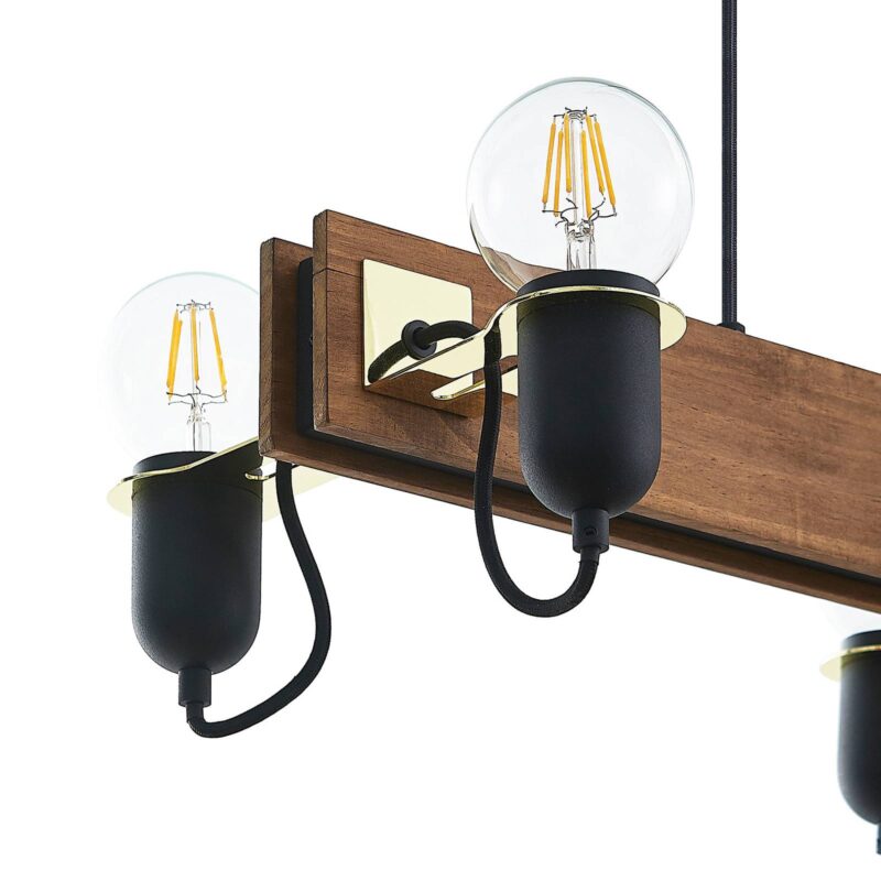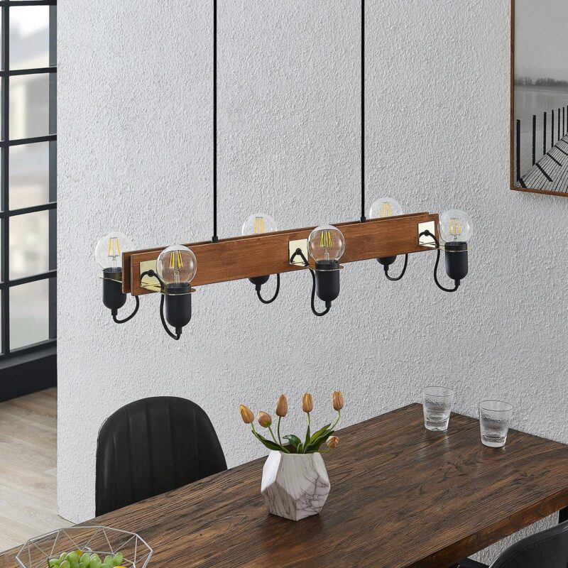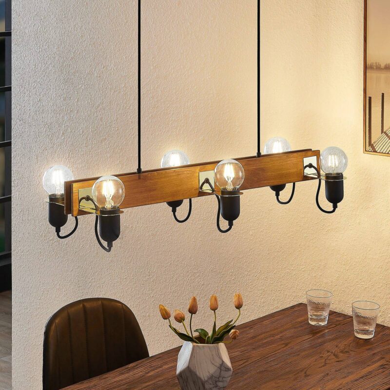 Závesné svietidlo Beam Becky s drevenými a čiernymi objímkami, verzia so šiestimi žiarovkami – ideálne na osvetlenie stola Becky sa dá dobre umiestniť nad pult alebo jedálenský stôl v obývacej časti. Závesné svietidlo pozostáva z podlhovastej drevenej tyče s mierne tmavšou starožitnou povrchovou úpravou, ku ktorej je pripevnených šesť objímok E27 v čiernej farbe, zatiaľ čo ďalšie prvky z lesklej mosadze vytvárajú vydarenú kombináciu farieb, ktorá účinne rozvíja svoje čaro aj v škandinávskych štýloch zariaďovania a vždy pôsobí elegantne a štýlovo. Okrem toho sa škandinávske štýly bývania vyznačujú najmä používaním prírodných materiálov – v tomto prípade dreva – a súčasne redukovaným formálnym jazykom so zameraním na to podstatné. To platí aj pre závesné svietidlo do jedálne Becky, ktorého zásuvky smerujú nahor, aby sa vytvorili mimoriadne príjemné svetelné podmienky. Použitie zrkadlových svietidiel je mysliteľné a potom zaručuje ešte väčšiu útulnosť osvetlenia obývacej izby.