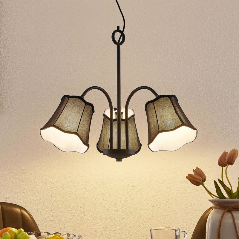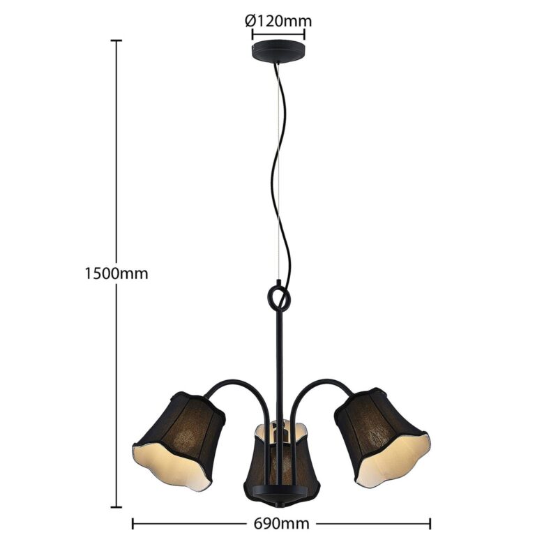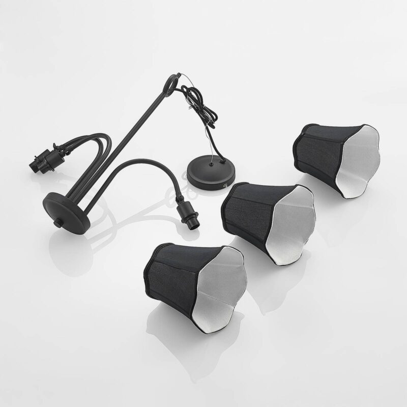 Trojlampa Binta s textilným závesným svietidlom s textilným tienidlom v čiernej farbe, nostalgický dizajn Binta sa dobre hodí nad jedálenský stôl alebo stôl v obývačke, dobre osvetľuje povrch stola, ale stlmuje svetlo do strán a vytvára útulné svetlo. Všetky tri tienidlá sú čierne, rovnako ako rám, a okraj má zvlnený dizajn, ktorý šikovne podčiarkuje nostalgický vzhľad tejto závesnej lampy. Exkluzívny dizajn dodáva závesnému svietidlu osobitý nádych a rozhodne skrášli klasické obývacie izby.