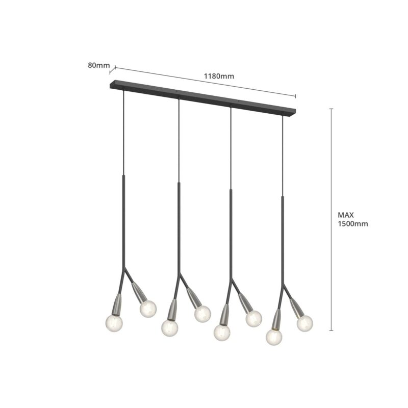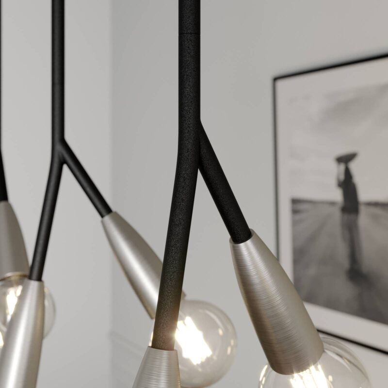 Závesná lampa Carlea s ôsmimi svetlami v čiernej a niklovej – optimálny zdroj svetla nad jedálenský stôl Carlea je pekná závesná lampa do jedálne v modernom štýle, ktorá nadchne kvalitným dizajnom. Zo stropného držiaka visia celkom štyri rozvetvené svetelné zdroje, ktoré majú po dve objímky E27. Preto je Carlea závesná lampa s ôsmimi svetlami ideálna na použitie v jedálni, pretože umožňuje jasné, celoplošné osvetlenie plochy stola. Svietidlá nie sú dôležité len z technického hľadiska na generovanie svetla, ale sú dominantné aj vo vzhľade závesnej lampy. Z tohto dôvodu by sa mali vyberať tak, aby dobre dopĺňali celkový vzhľad. Vláknové žiarovky s technológiou LED spĺňajú túto požiadavku veľmi dobre.