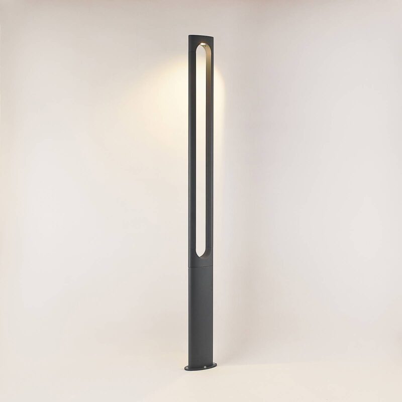 Pozoruhodné svietidlo LED stožiara Dovino vyrobené z robustného tlakového liateho hliníka Svietidlo stožiara Dovino LED ohromuje celoplošne svojím jednoduchým, ale veľmi osobitým dizajnom. Rám z tlakového liateho hliníka stúpa obdĺžnikovo z podlahy a má uprostred veľký, dlhý otvor v tvare oválu. Pozdĺž vnútorného okraja otvoru sú trvale namontované LED s nízkou spotrebou, ktoré vyžarujú jemné, teplé biele svetlo. Trieda ochrany IP65 je ideálne vhodná pre vonkajšie použitie a robí z tejto žiarovky dlhotrvajúci spoločník každý deň. Dovino vyzerá obzvlášť dobre v moderných vonkajších priestoroch.