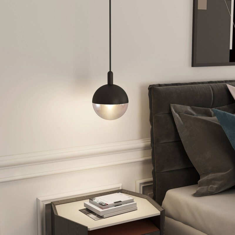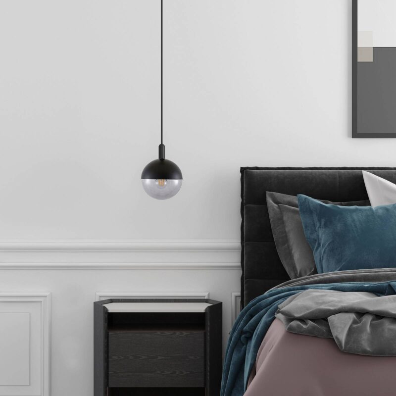 Guľová závesná lampa Dustian v extravagantnom prevedení z čierneho kovu a skla Dizajn tejto okrúhlej závesnej žiarovky vyzerá vznešene a trochu hravo a stelesňuje elegantný dvojzložkový vzhľad, pretože tienidlo v guľovom tvare je vyrobené z čierneho kovu a číreho skla v takmer rovnakých častiach. Pomocou otočného mechanizmu sa tieto dva komponenty po výmene žiarovky dajú rýchlo odstrániť jeden od druhého a potom sa dajú zostaviť rovnako rýchlo. Otvor je taký veľký, že je možné použiť guľové žiarovky až do priemeru 9,5 cm. Takáto veľká žiarovka je samozrejme obzvlášť pekná za priehľadným sklom. Alternatívou je použitie žiarovky so zrkadlovou hlavou alebo osvetľovacích prostriedkov s mimoriadne teplou farbou svetla. To tiež celkom dobre zapadá do trendy povrchu v čiernej farbe. Ako závesná lampa je Dustian skutočným charakterom s jedinečným vonkajším povrchom a môže byť integrovaná do mnohých obytných priestorov, kde poskytuje nielen svetlo, ale skutočne funguje aj ako dekoratívny prvok s dizajnovým charakterom.